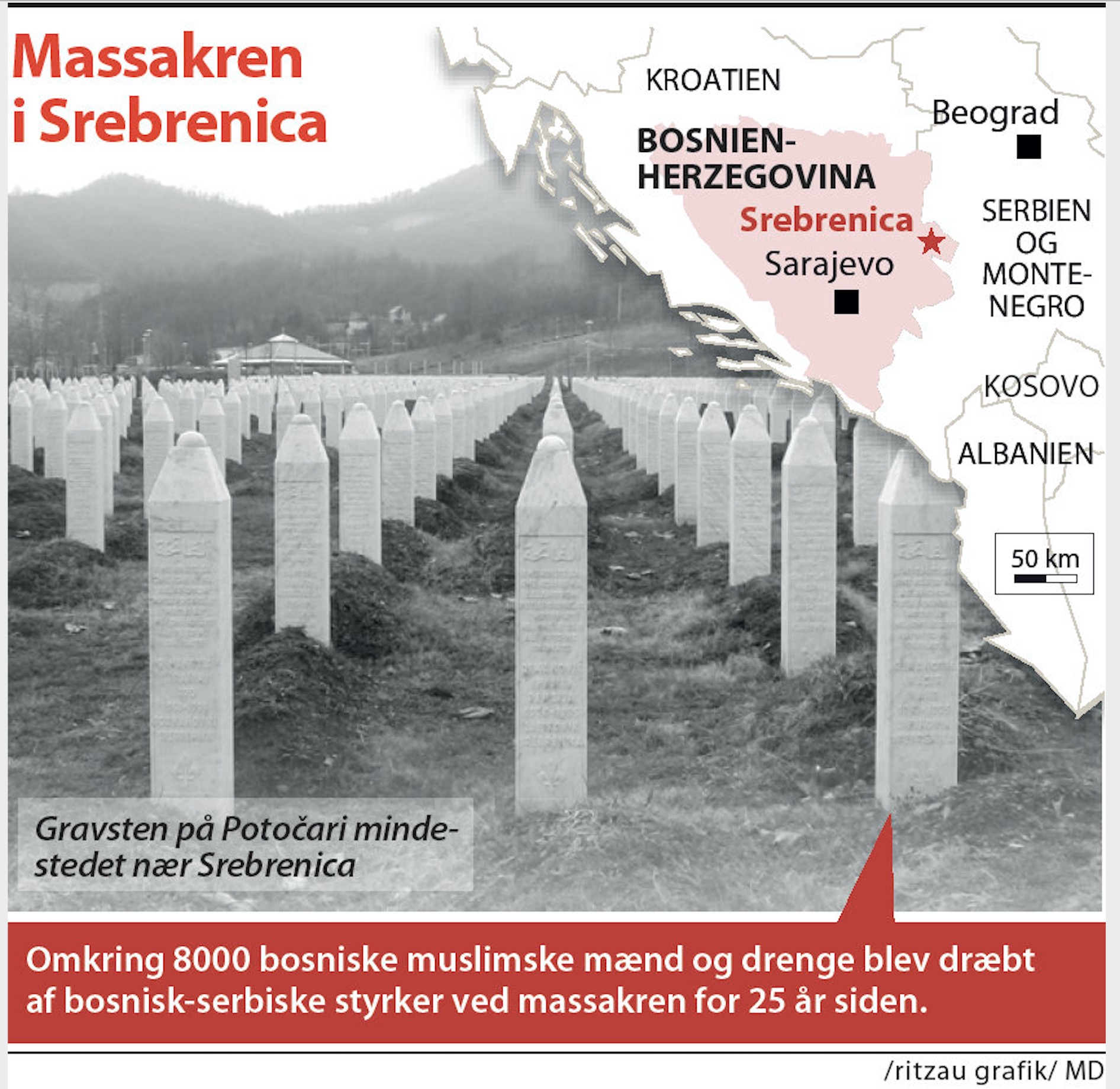 Tann 11. juli í 1995 hertóku bosniskt-serbiskar herdeildir undir leiðslu av Ratko Mladic, herovasta, býin og upp á minni enn tvær vikur vórðu 8.000 muslimskir menn og dreingir systematiskt avrættaðir. Kvinnur og børn vóru send úr býnum.