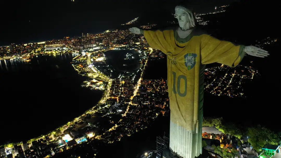 Kendasta ímyndin av Rio de Janeiro, og mest vitjaða ferðamálið í Brasil, 38 metrar høga Kristus-standmyndin var íklødd landsliðstroyggjuna hjá Pelé.
