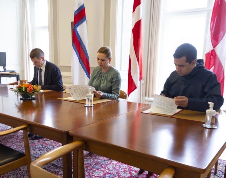 Nú verður farið undir eitt nýtt samstarv ímillum londini í ríkisfelagsskapinum. Tað er Samstarvsráðið ímillum Danmark, Føroyar og Grønland, sum nú fer til verka. Seinnapartin í dag hava teir tríggir stjórnarleiðararnir í ríkisfelagsskapinum, Mette Frederiksen, Bárður á Steig Nielsen og Muté B. Egede skrivað undir eina avtalu um treytirnar fyri samstarvið.