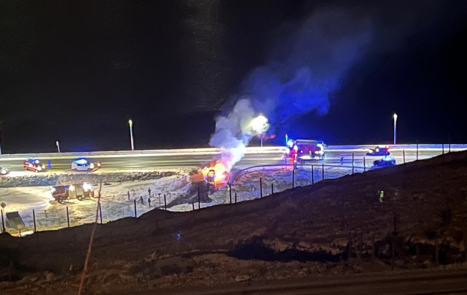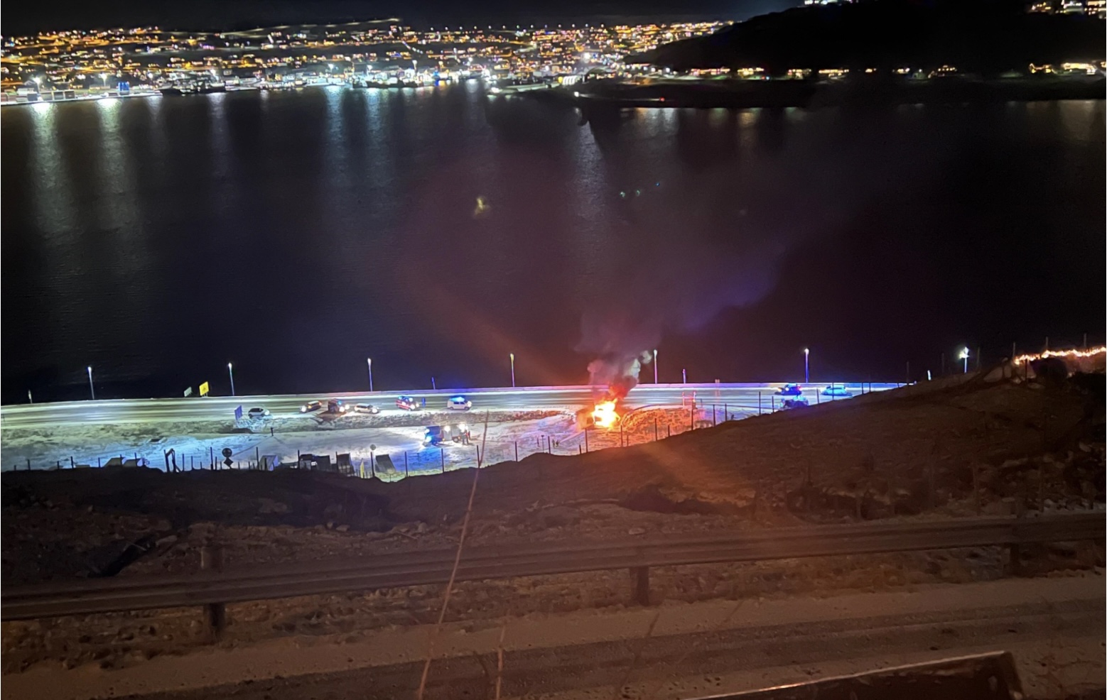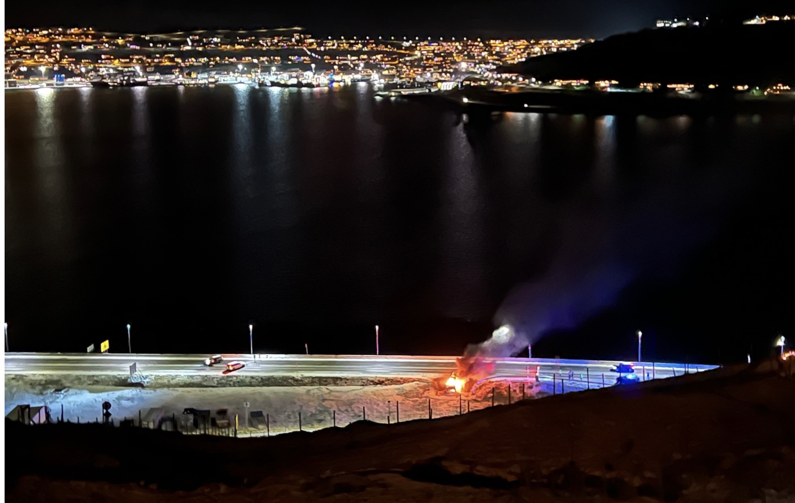 Løgreglan fekk fráboðan um eldin klokkan 20:20. Bilurin stóð á økinum fram við vegnum millum tunnilsmunnan og rundkoyringina á Strondum. Orsøkin til tað var, at bilførarin koyrdi til síðis, tí tað reyk úr bilinum. Hann helt, at bilinum tørvaði kølivatn. Men tá vísti tað seg, at ein lítil eldur var í motorrúminum. Bilførarin helst seg hava sløkt eldin, og fekk onkran at koma eftir sær.