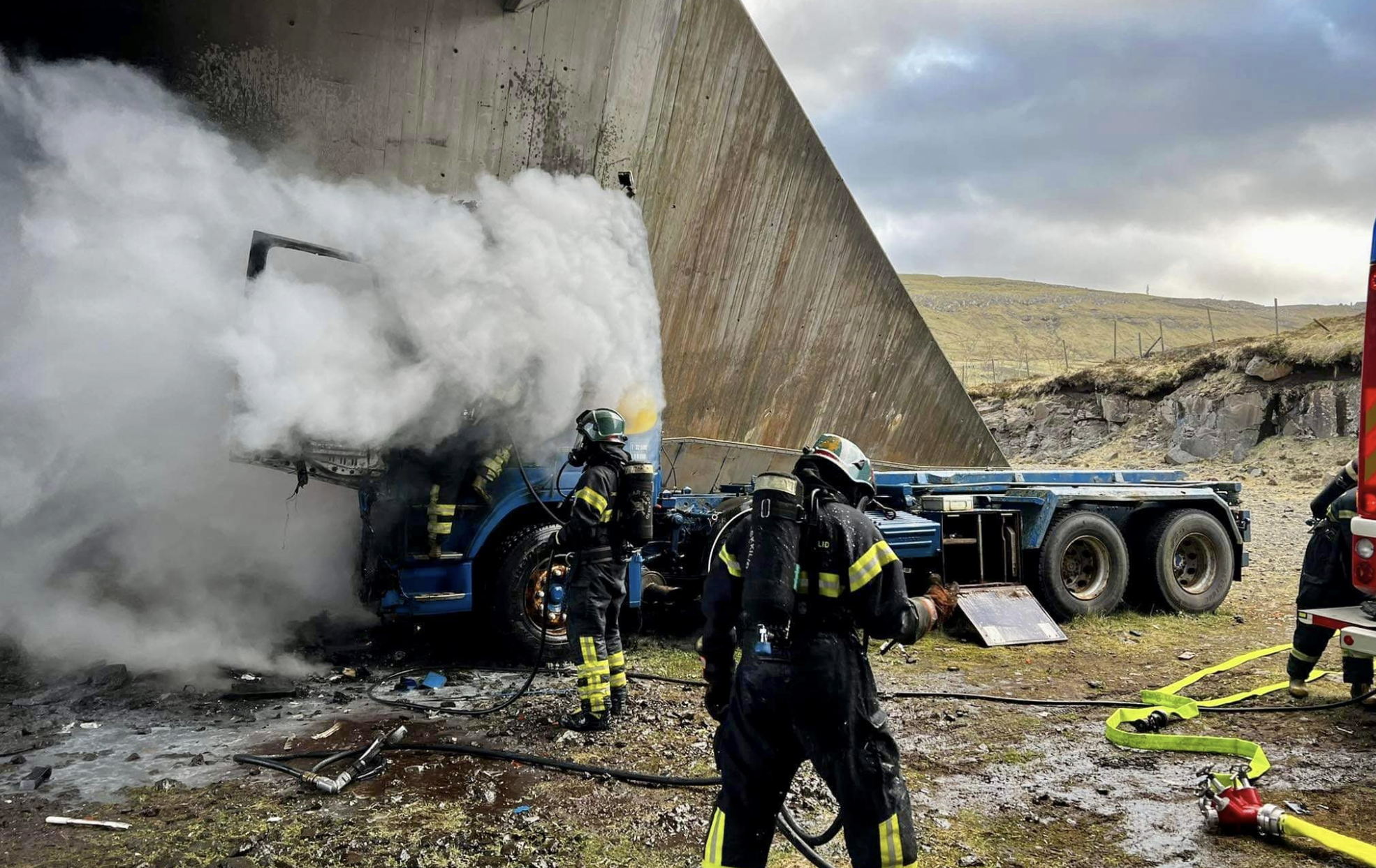 Eingin fólkaskaði var, men lastbilurin er útbrendur. Løgreglan kannar nú orsøkina til eldsbrunan.