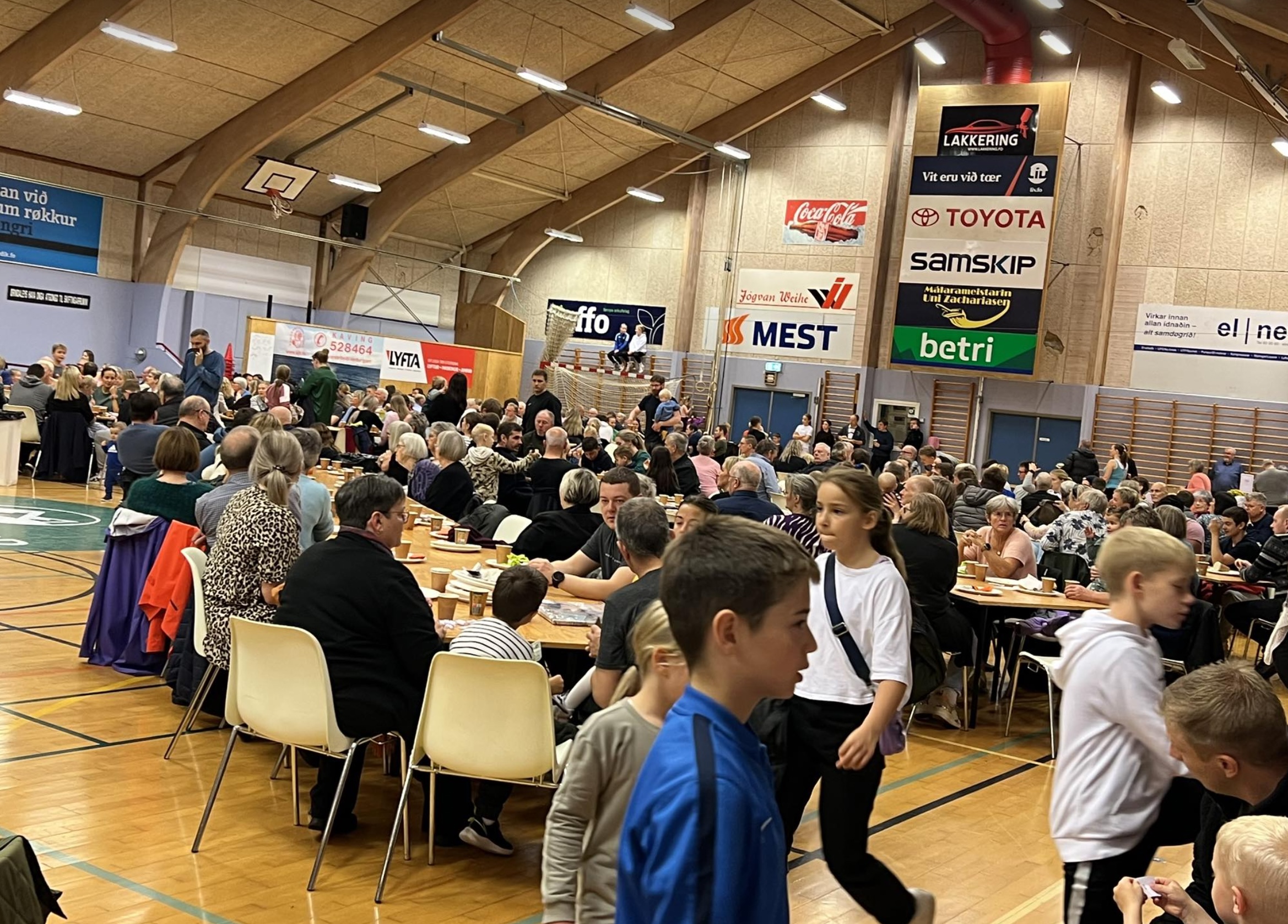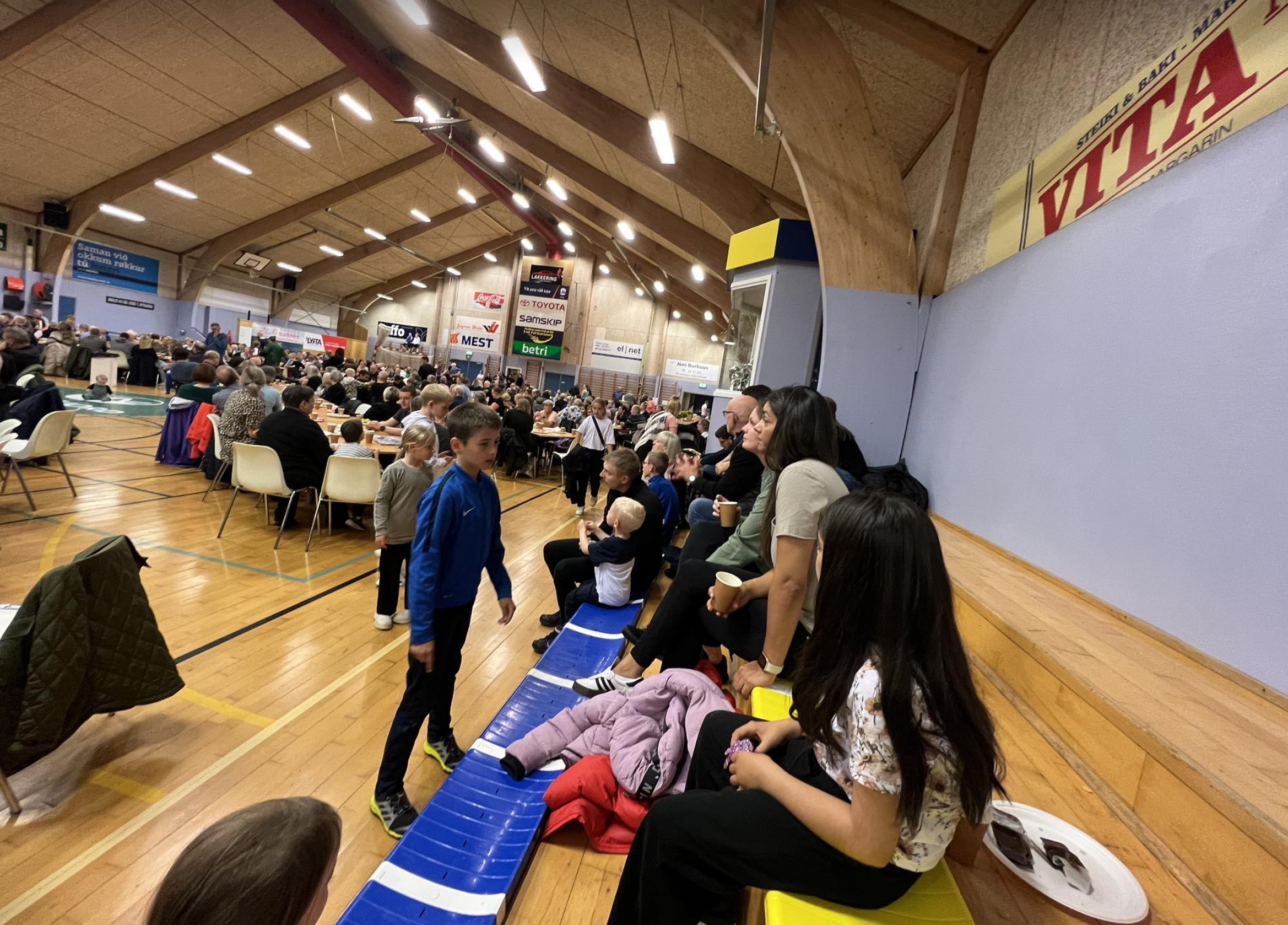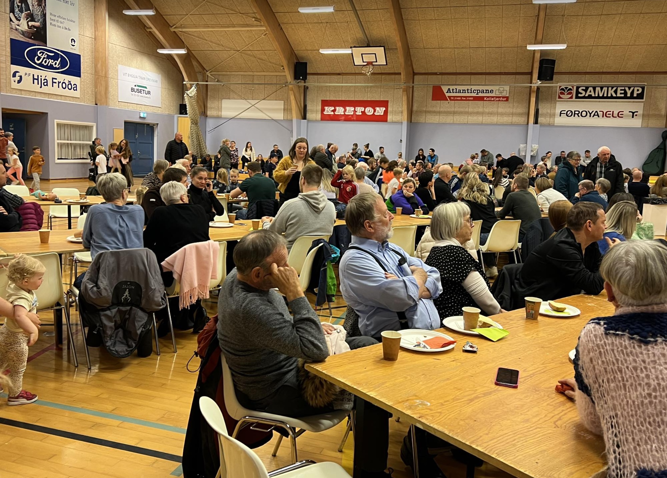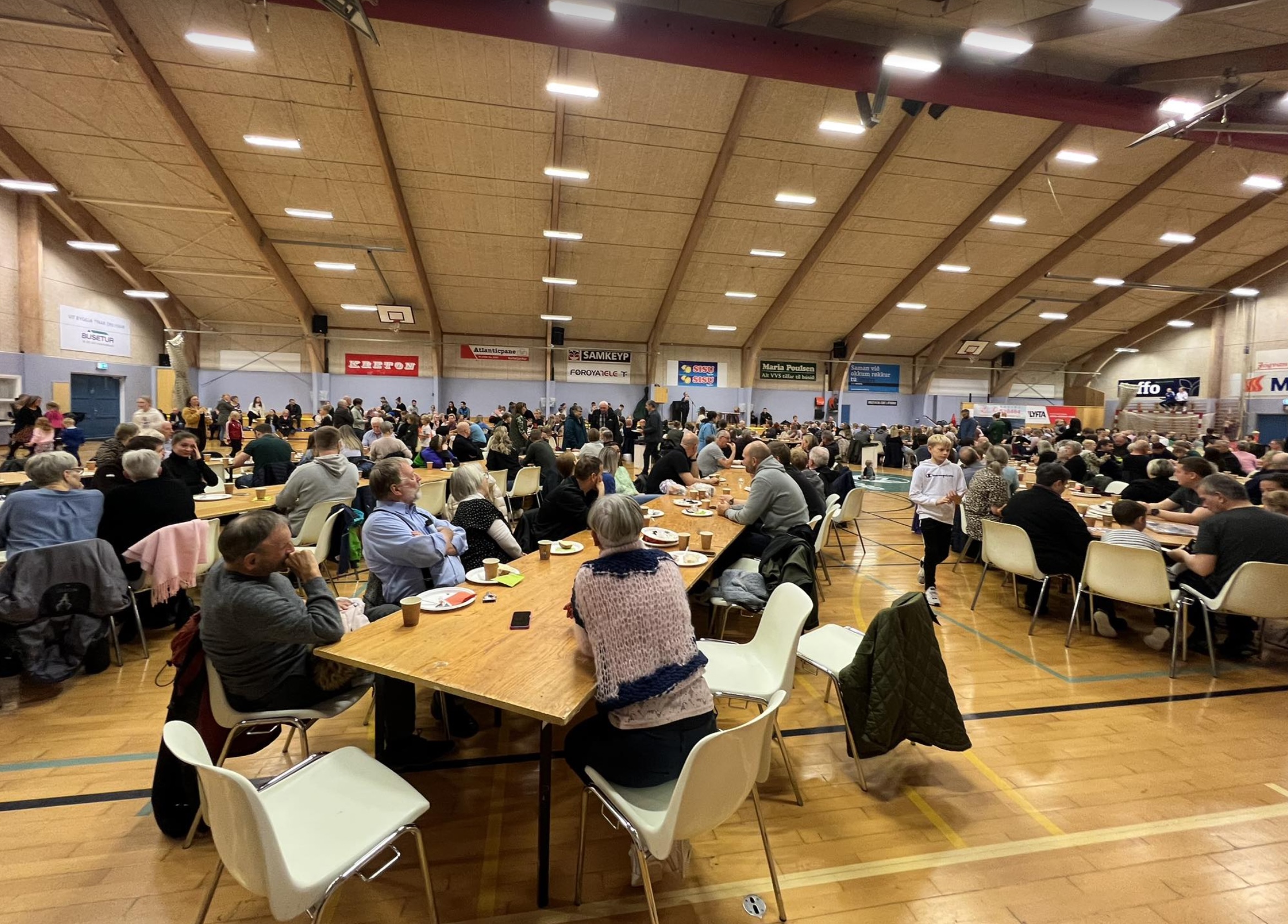 Í morgun var stóra morgunmatarborðið í Ítróttarhøllini í Vestmanna í sambandi við Vestmannadagar.