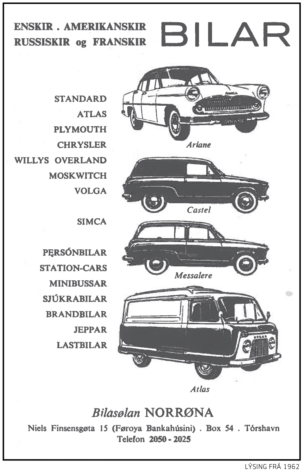 Um tað mundið, tá dagsins bilur sá dagsins ljós á fyrsta sinni í USA í 1959, vóru um 1.000 bilar í Føroyum. Í dag eru akførini 41 ferðir so nógv í Føroyum. Hagtøl frá Akstovuni frá 1960 vísa, at tá vóru 111 persónbilar í Føroyum. Hýruvognarnir vóru tá fleiri í tali enn persónbilarnir. Tá vóru 208 hýruvognar, 450 vøru- og lastvognar, 15 bussar, 2 sjúkravognar og ein brandvognur. Motorsúkklurnar vóru 236 í tali.