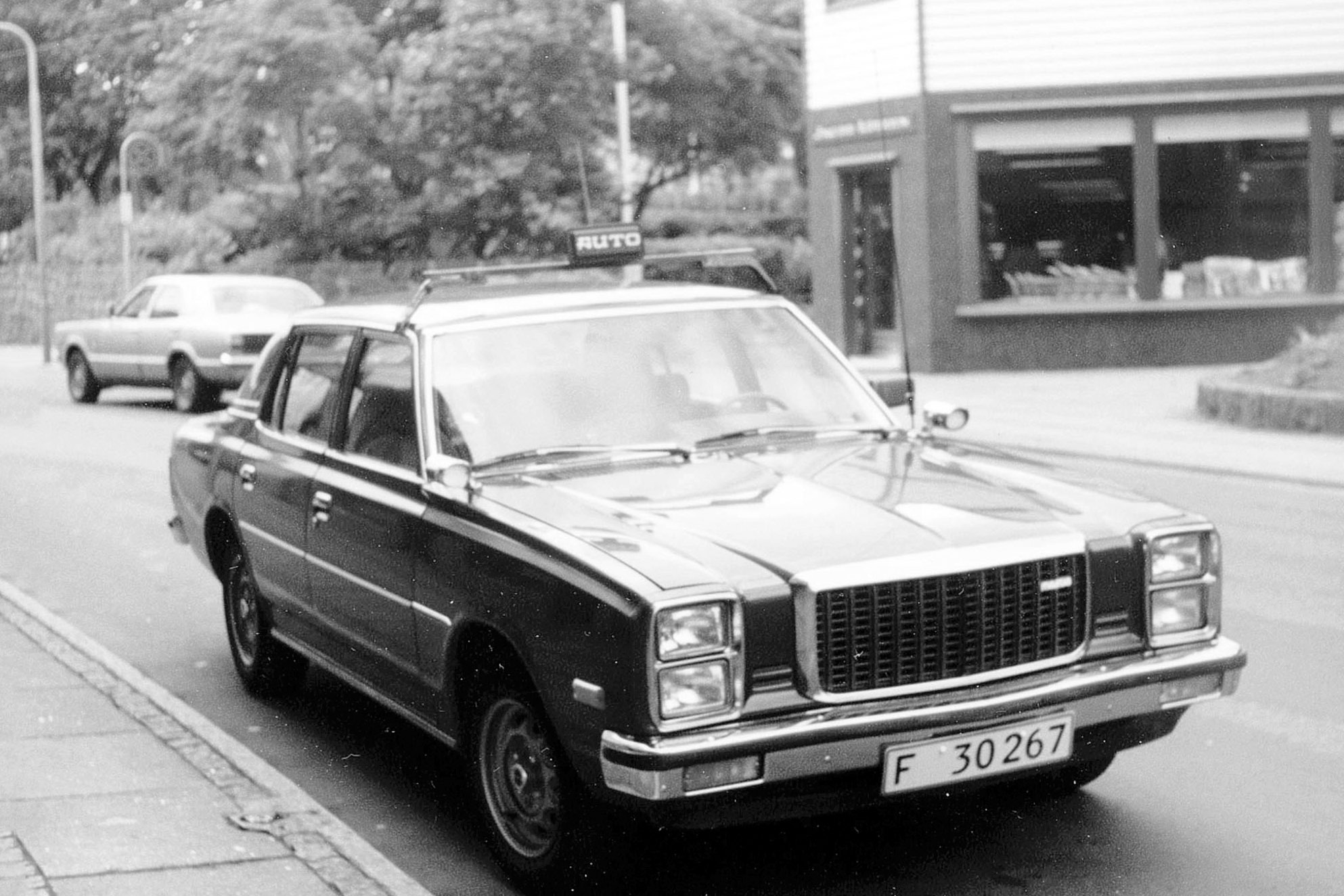 Mazda 929L hjá Eivind Lilå sum koyrdi á bilstøðini Auto í Havn. Bilurin hevur taxalyktir á forskermunum, sum var eitt krav tá. Hesir Mazda 929L vórðu framleiddir frá 1978-80. Mynd: Eivind Lilå