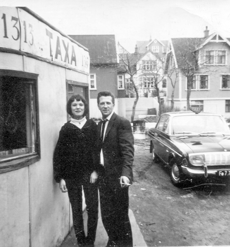 Myndin er tikin við bilstøðina Taxa 1313 við Niels Finsensgøtu í Havn. Fólkini á myndini eru Harriet Nybo og Petur Clementsen. Petur koyrdi í Taxa og seinni í bilstøðini Bil tel. 1444. Á parkeringsøkinum hjá støðini er ein Ford Taunus 17M við Taxa skelti á takinum. Støðin var í húsunum hjá Hans Andreas Djurhuus (Dia á Vertshúsinum) á horninum Niels Finsengøta/Sjúrðargøta yvir av Sjónleikarhúsinum. Úr myndasavninum hjá Birgari Johannesen