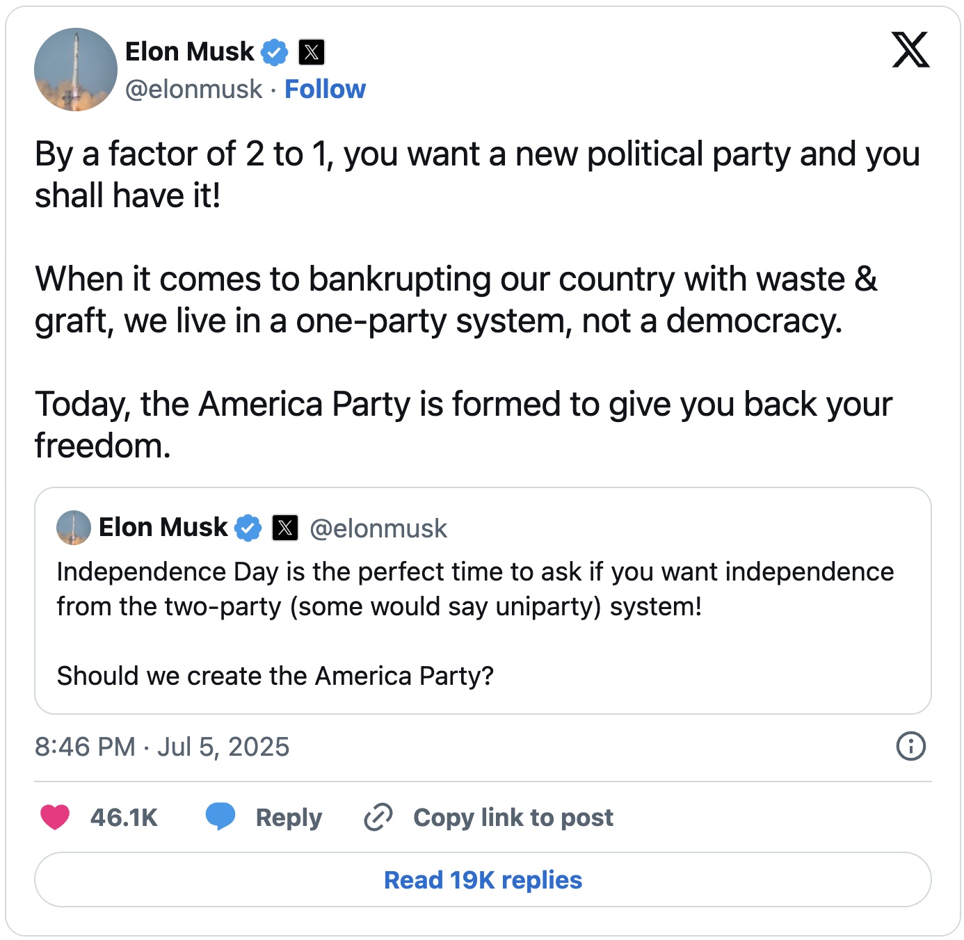 Við floksgrundarlagnum tekur hann í álvara sínar útsagnir um at stovna ein flokk, um Donald Trump forseti samtykti stóra lógarpakkan, sum Trump sjálvur hevur kallað "Big, Beautiful Bill".