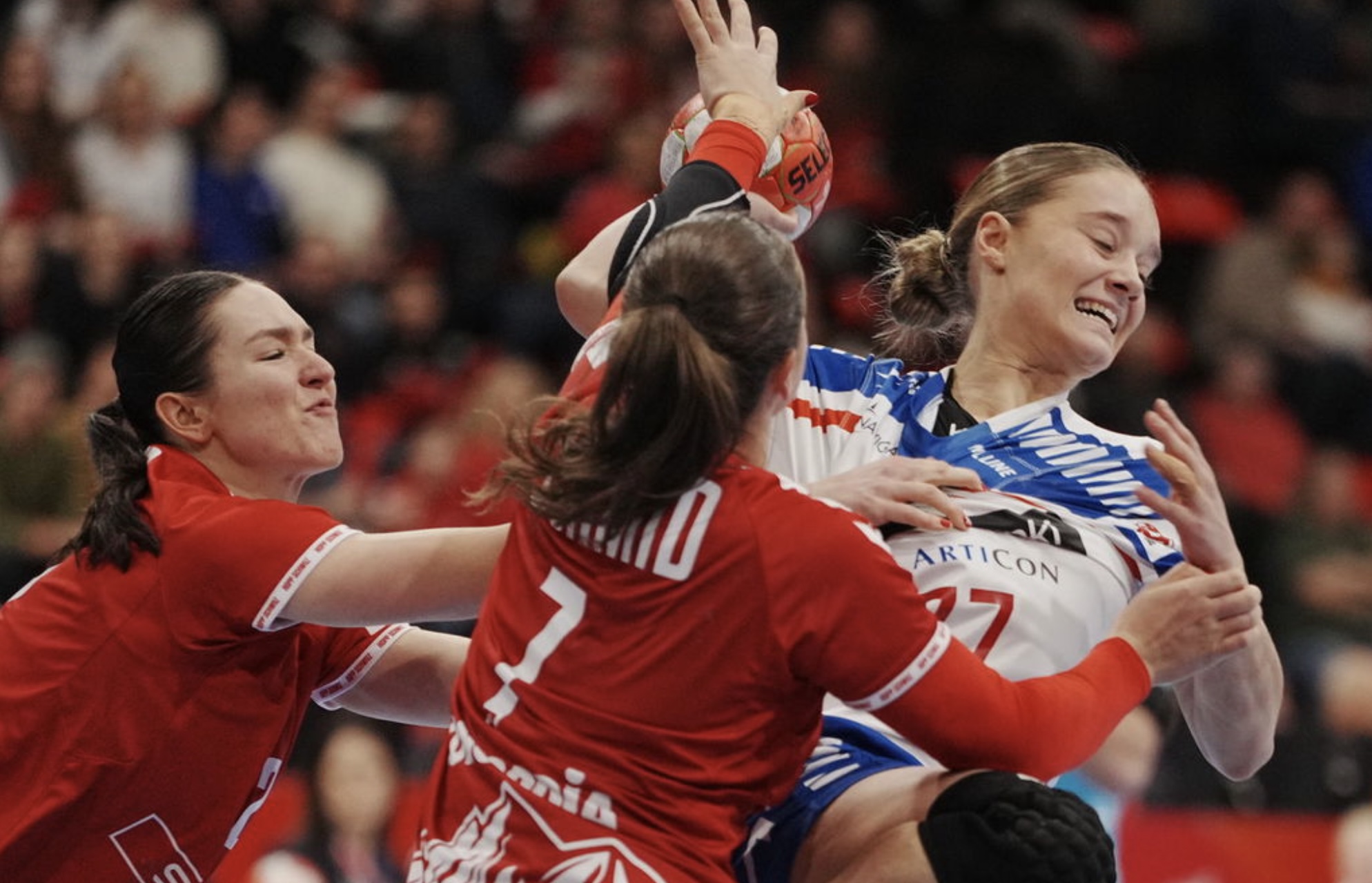 Hálvleikur er í fyrsta søguliga EM-endaspælsdystinum hjá føroysku hondbóltskvinnunum í Sankt Jacobshøllini í Basel í Sveis.