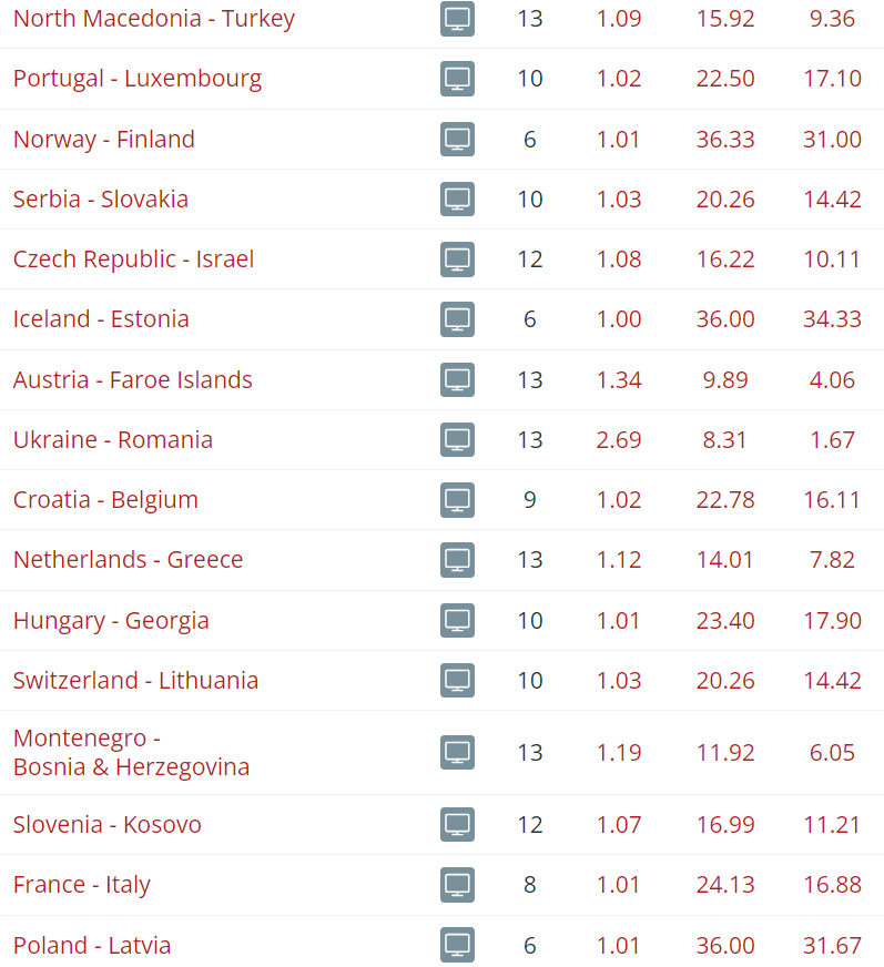 Tey styrkismettu liðini hava heimavøll í tí seinasta dystinum. Miðaloddsini hjá veddingarfyritøkunum vísa, at veddingarfyritøkurnar halda, at tey veiku londini hava lítlan og ongan møguleika móti tí hægri styrkismetta landinum á útivølli.
