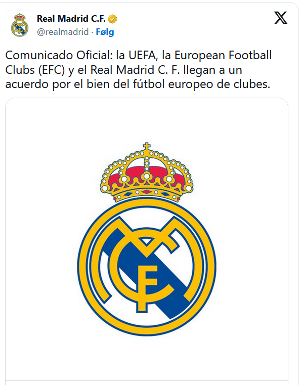 Tey í Madrid hava nú innsæð, at eingin orsøk er at halda fast við eina verkætlan eingin tekur undir, og í dag boðar felagið frá á X - fyrrverandi Twitter - at Real Madrid fer úr verkætlanini, ið sostatt hevur fingið endaliga banahøggið.