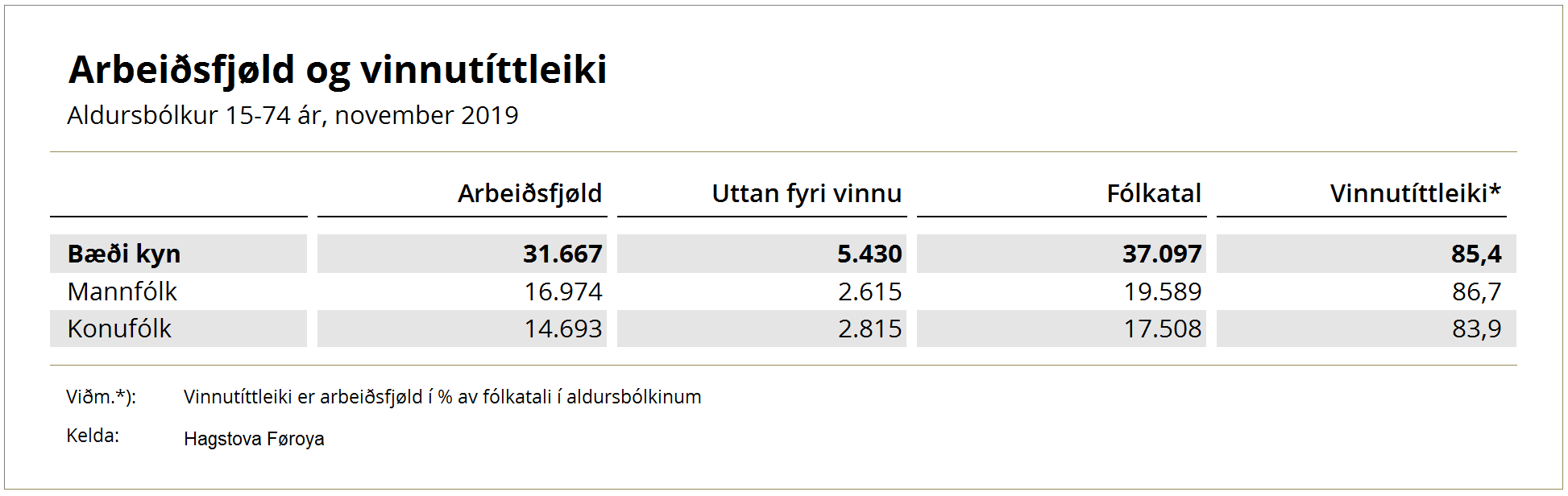 Vinnutíttleikin, ið er arbeiðsfjøldin í prosent av fólkatalinum, er sostatt er 85,4%, roknaður fyri bæði kyn.