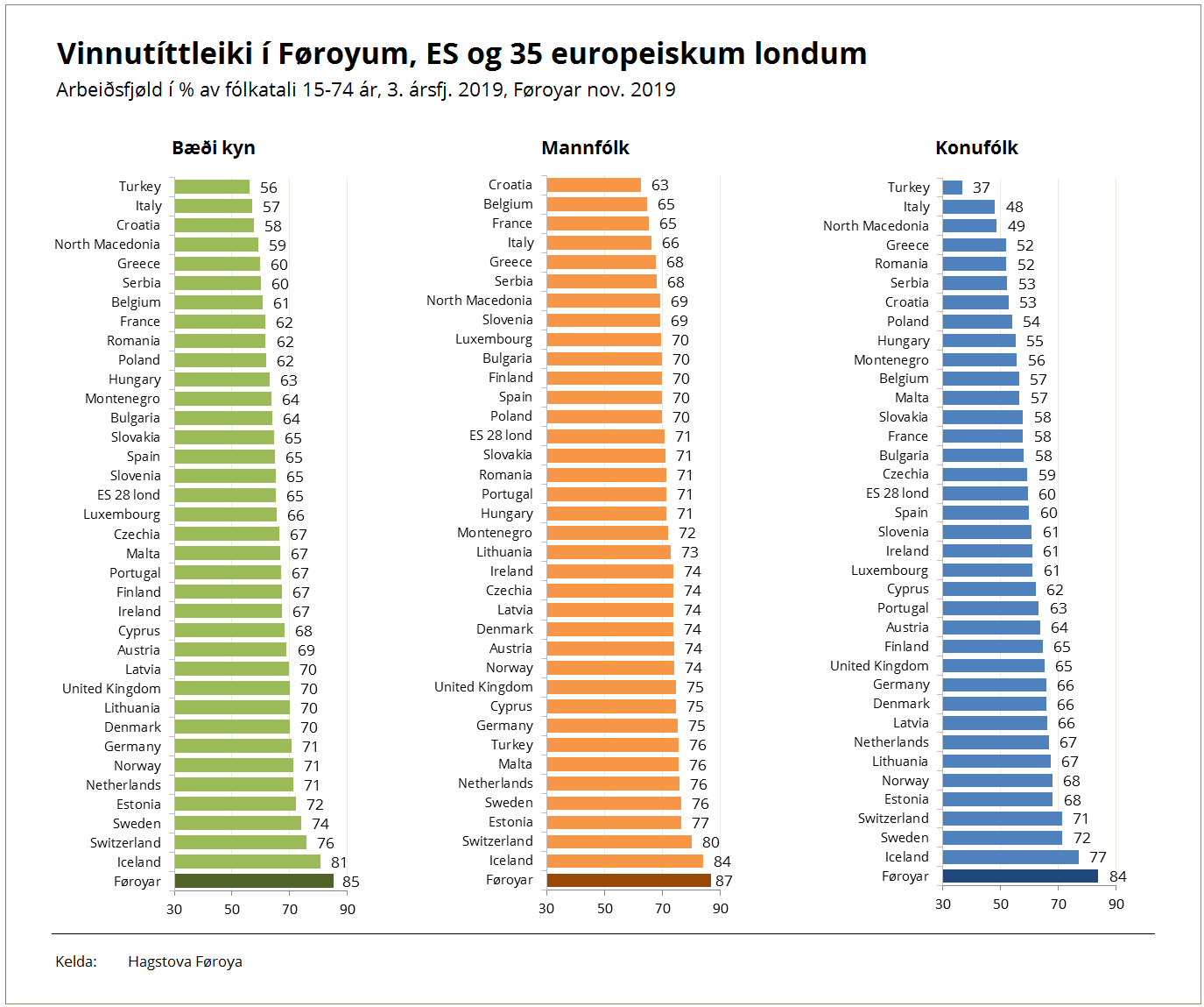 Hjá monnum eru Føroyar á odda við 87% og síðani Ísland við 84%. Í Danmark er talið 74%. ES-miðaltalið er 71%. Lægstur er vinnutíttleikin hjá monnum í Kroatia, Belgia, Fraklandi og Italia við 63-66%.
