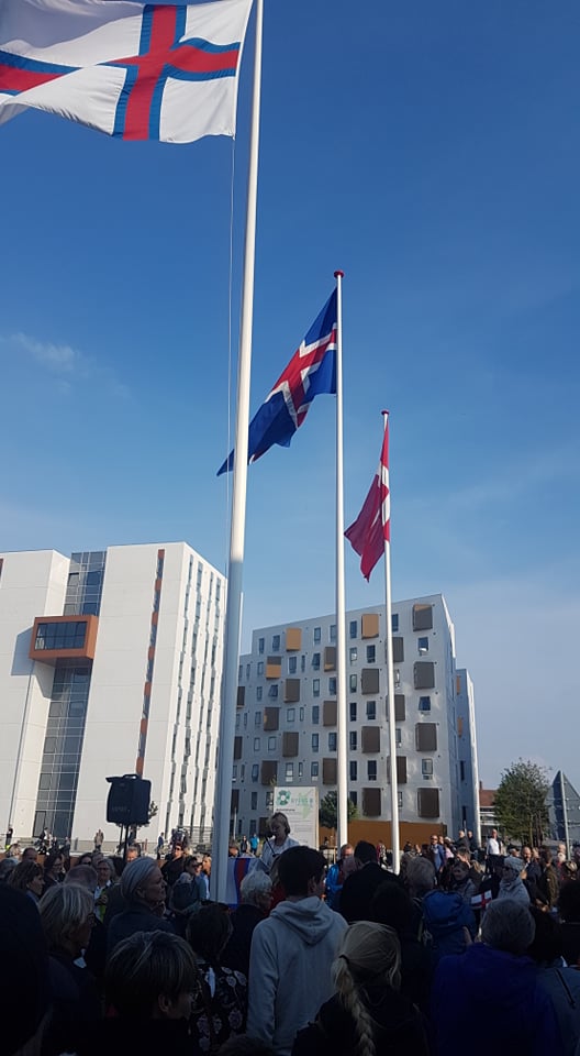 Seinnapartin komu føroysku træskipini, sum eru á ferð í Danmark fyri at heiðra, at Merkið er 100 ár í ár, til Odense.
