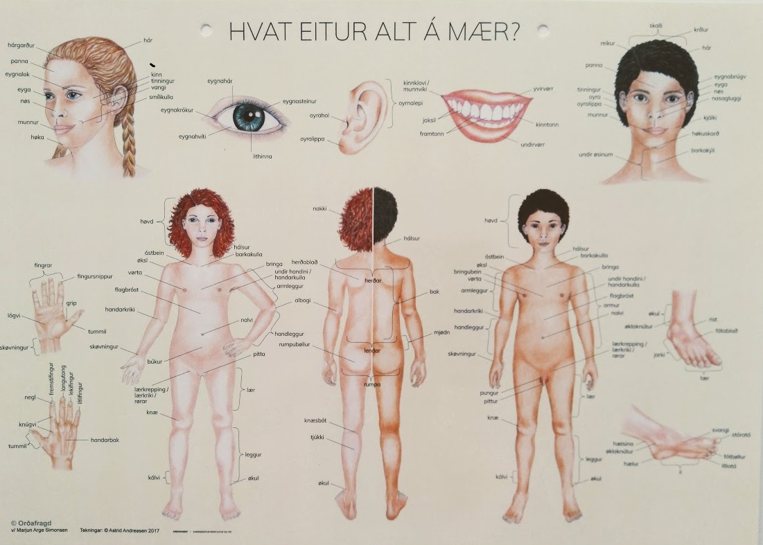 Á uppslagnum eru genta og drongur, og ávísir kropspartar eru teknaðir neyvari, tað er hond, fótur, høvur, eyga, oyra, munnur og tenn.