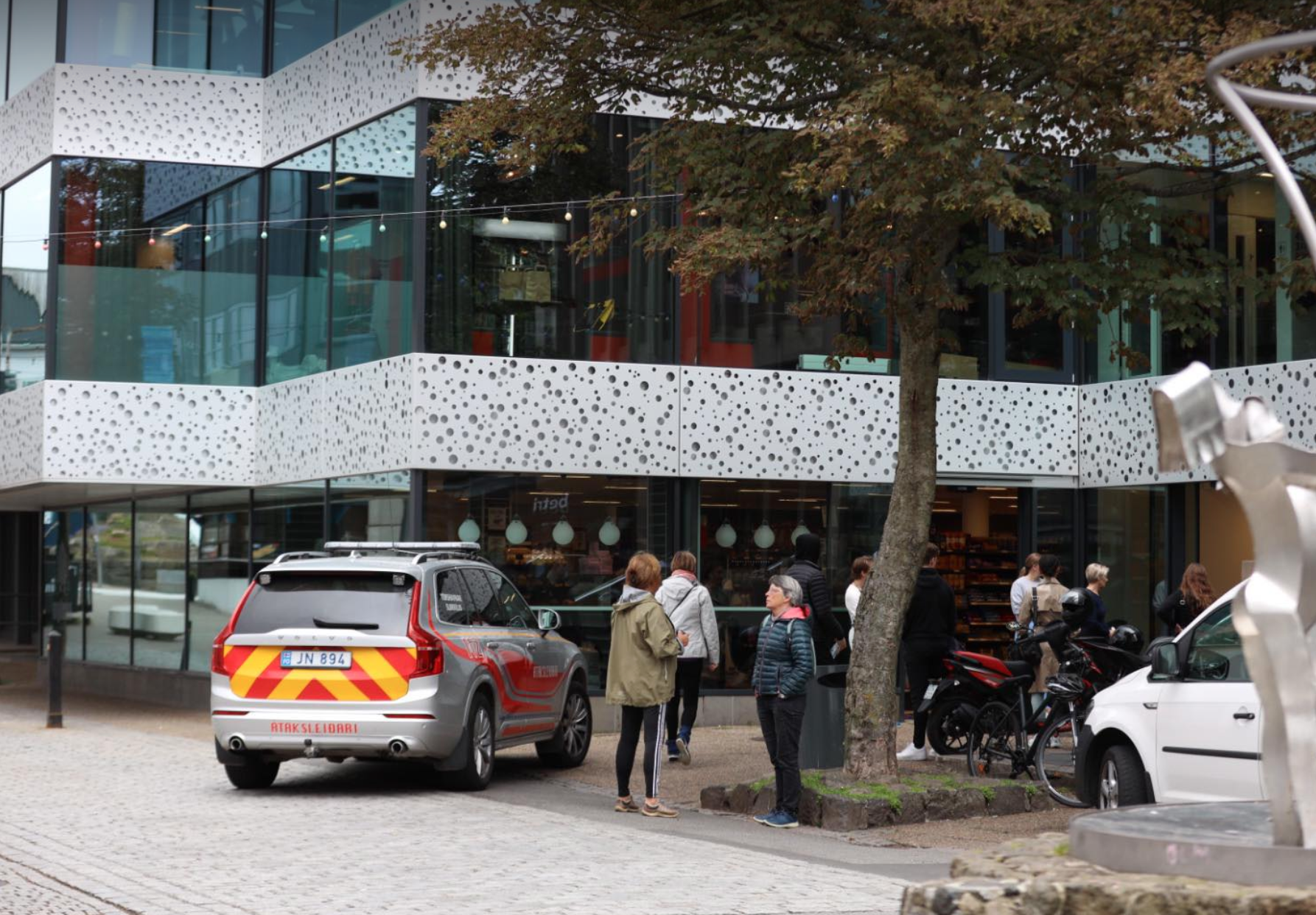 Sløkkiliðið var skjótt á staðnum, og tá vóru øll longu farin úr bygninginum. Átaksleiðarin hjá Tórshavnar Sløkkiliði fór inn at kanna málið, og hann staðfesti skjótt, at talan var um falskan alarm, og so kundu fólk fara inn aftur at venja.