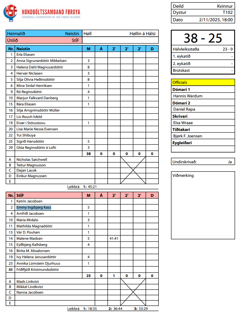 HER ber til frá HSF at síggja dómaraseðilin frá dystinum millum Neistan og StÍF: