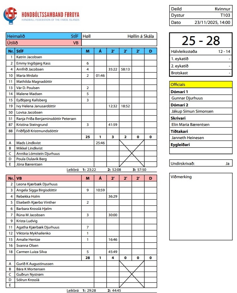 HER ber til at síggja dómaraseðilin hjá HSF frá dystinum StÍF-Neistin 25-28 (12-14):