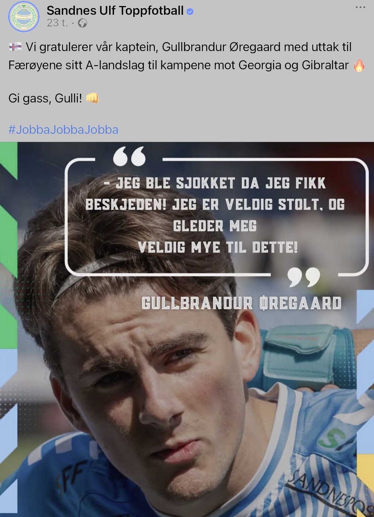 - Vit ynska okkara liðskipara, Gullbrandur Øregaard tillukku við, at hann er tikin út til dystirnar hjá føroyska A-landsliðnum móti Georgia og Gibraltar. Gev tí gass Gulli. Skrivar Sandnes ULF á Facebook.