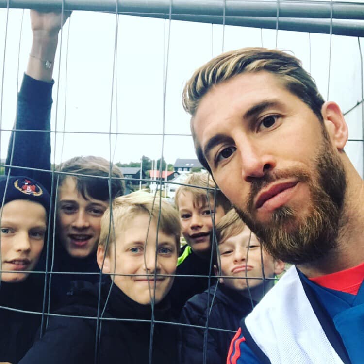 Stjørnan í miðverjuni hjá Real Madrid og spanska landsliðnum, Sergio Ramos, gav sær góðar stundir at taka myndir saman við føroyskum fjepparum á veg til venjing á Tórsvølli í gjár.