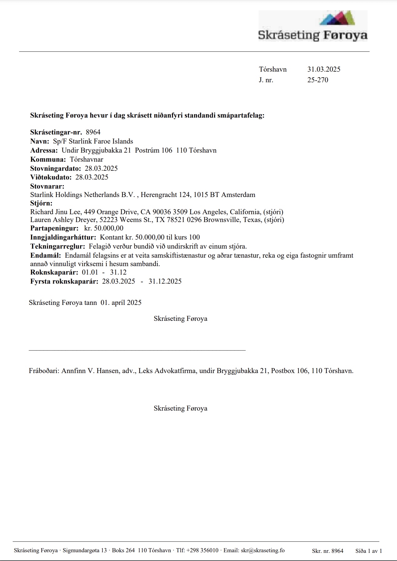Tað sæst á heimasíðuni hjá Skráseting Føroya, har Annfinn V. Hansen, advokatur, vegna eigararnar, hevur stovnað føroyska felagið.