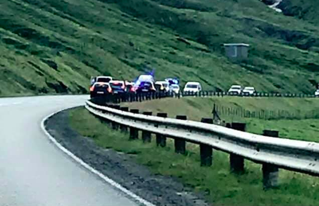 Fyri einari løtu síðani fekk løgreglan fráboðan um eitt ferðsluóhapp á Kaldbaksvegnum nakað framman fyri tunnilin til Kollafjarðar. Løgregla og sjúkrabilur vóru skjót á staðnum.