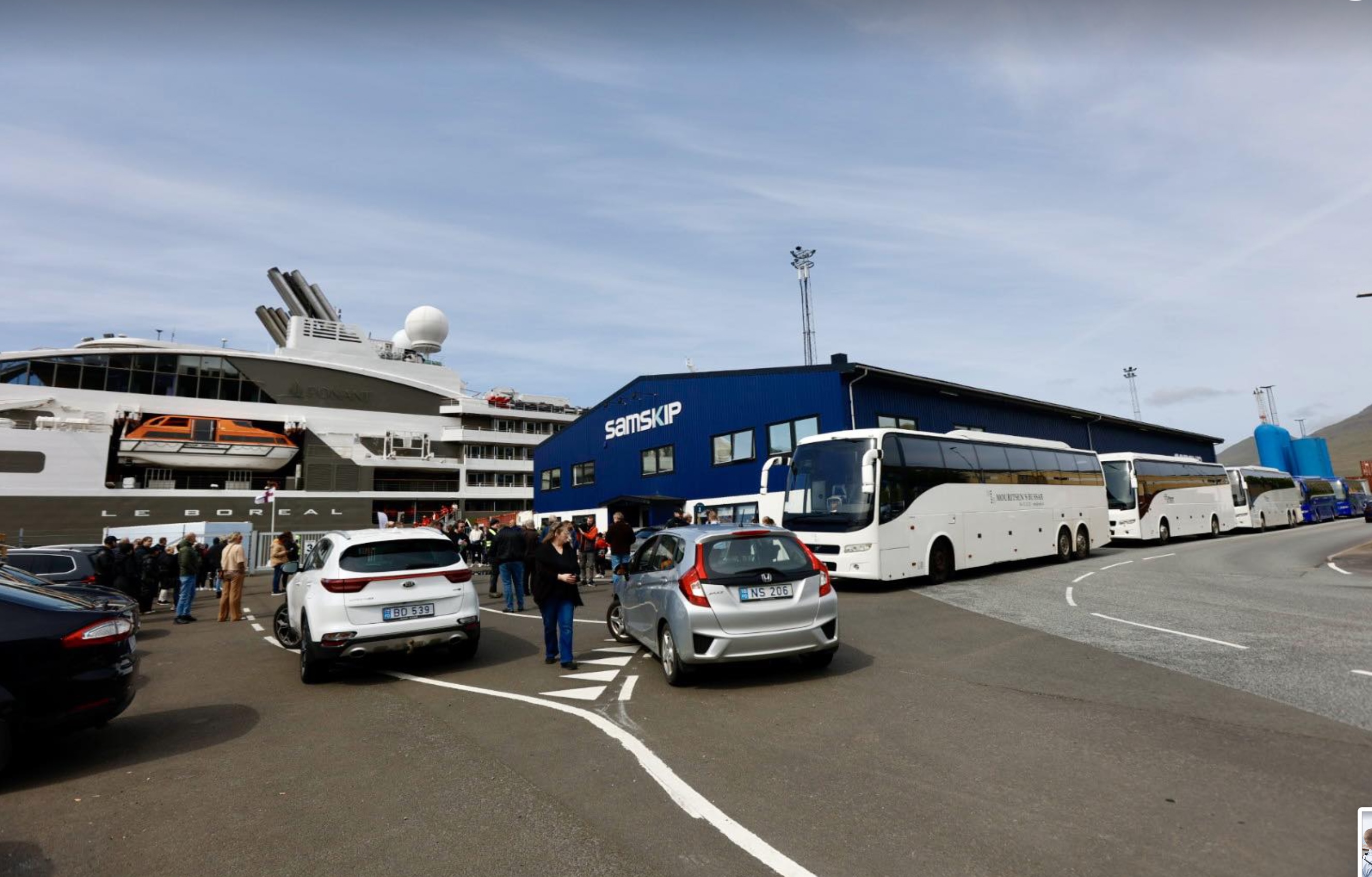 Skipið legði at stutt fyri klokkan 12, og um 13 tíðina sluppu ferðafólkini í bussarnar.