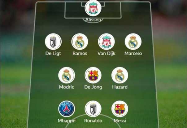 Til tiltakið í Milano í Italia bleiv eisini ársins lið sett. Flestu av spælarunum tykjast hava vunnið sær rættin til liðið. Har í millum Alisson Becker, Matthijs de Ligt, Virgil van Dijk, Frenkie de Jong, Eden Hazard, Cristiano Ronaldo og Lionel Messi.