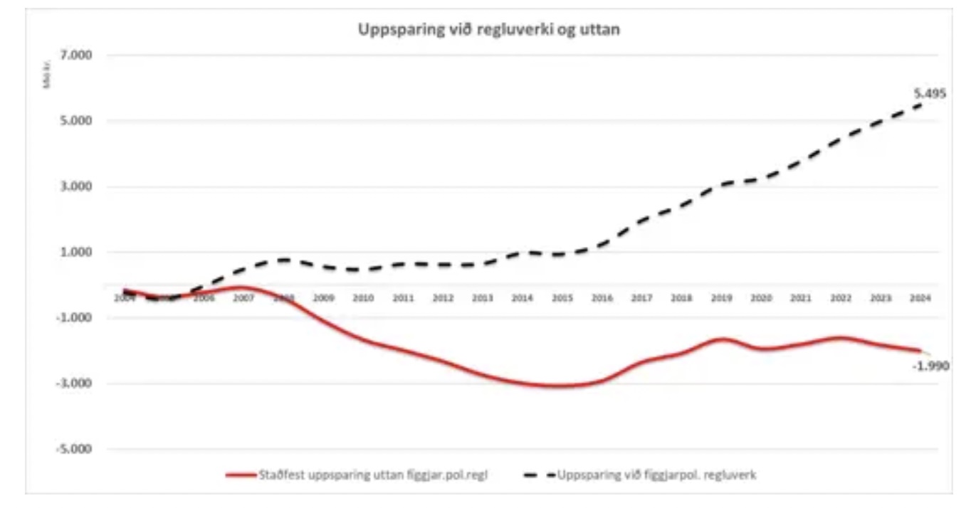 Myndin vísir, at heldur enn at hava eina negativa uppsparing í bestu tíðum – sum vit hava havt seinastu 20 árini - hevði við avmarkingini, sum Føroyar Arbeiðsgevarafelag skjýtur upp, verið talan um eina munandi uppsparing. Júst hvussu stór hon hevði verið, er torført at siga akkurát, men fleiri milliardir høvdu verið á muni. Í roknidøminum er munurin 7,5 milliardir.