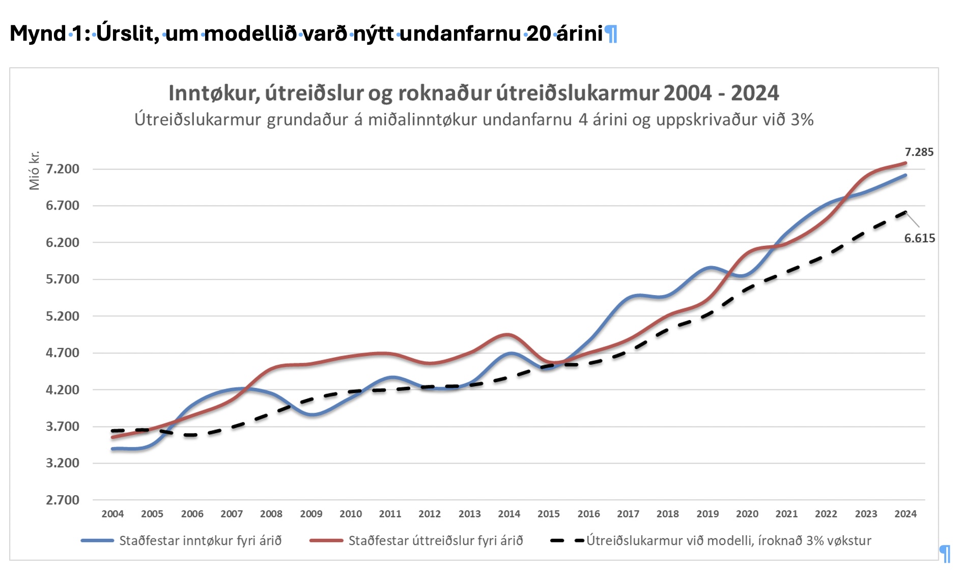 Í mynd 1 er tann bláa strika staðfestu inntøkurnar seinastu 20 árini, og tann reyða vísur staðfestu útreiðslurnar í almenna roknskapinum. Tann svarta strikaða linjan er roknaði útreiðslukarmurin sambært modellinum fyri fíggjarpolitiskt reguverk. Tað sæst í myndini, at útreiðslugongdin bæði hevði verið meira jøvn og meira hóvlig, um hesin myndilin hevði verið nýttur í einum fíggjarpolitiskum regluverki seinastu 20 árini.