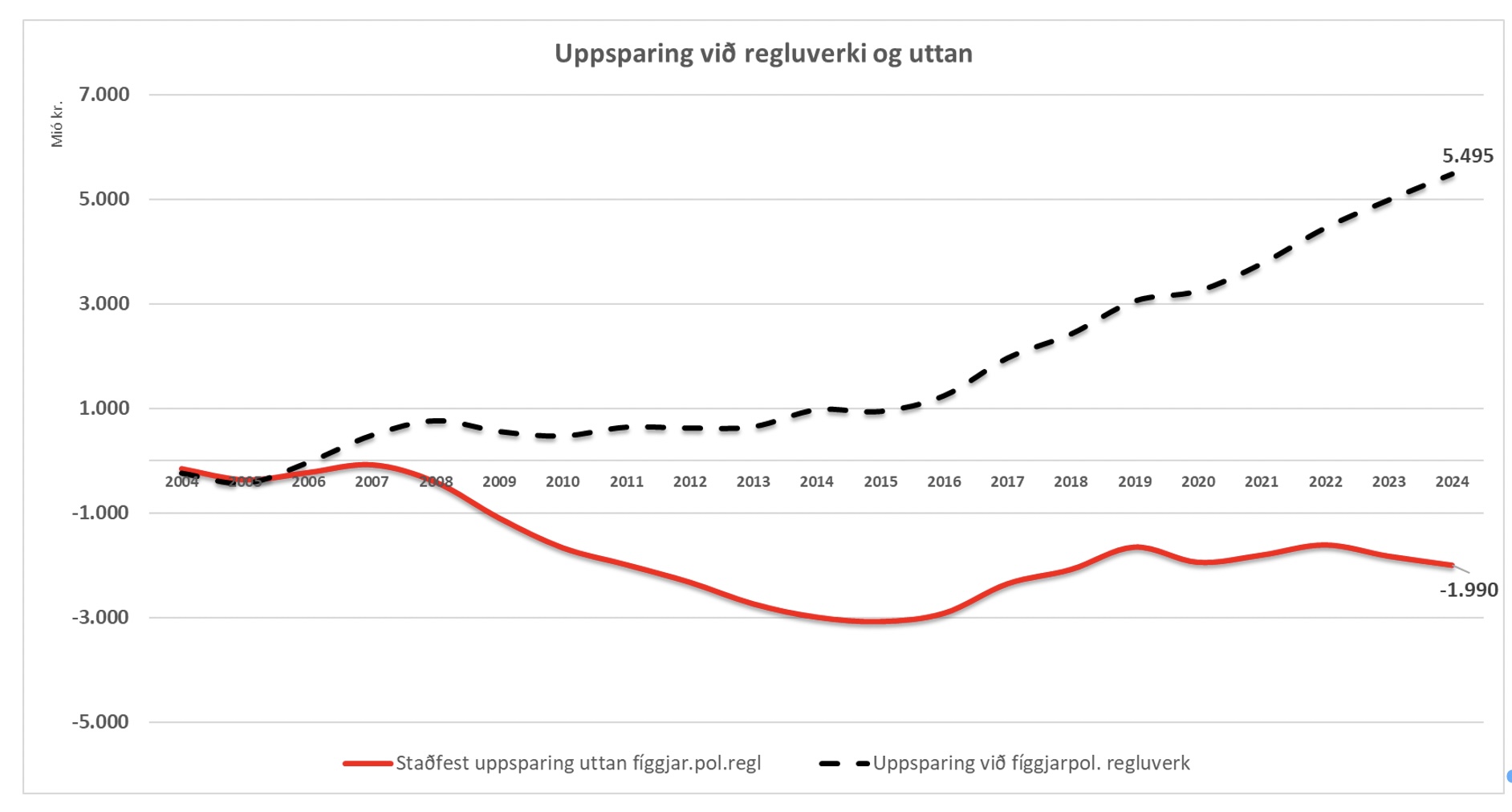 Í mynd 2 sæst, at nettoupparingin hjá landinum hesi seinastu 20 árini (2004-24) hevði verið fleiri milliardir hægri, um hesin myndilin fyri fíggjarpolitiskt regluverk hevði verið settur í verk fyri 20 árum síðani. Ein negativ uppsparing hevði verið til eitt trivaligt pluss. Júst sum tað eigur at verða, tá tíðirnar hava verið so góðar, sum tær hava verið seinastu nógvu árini.