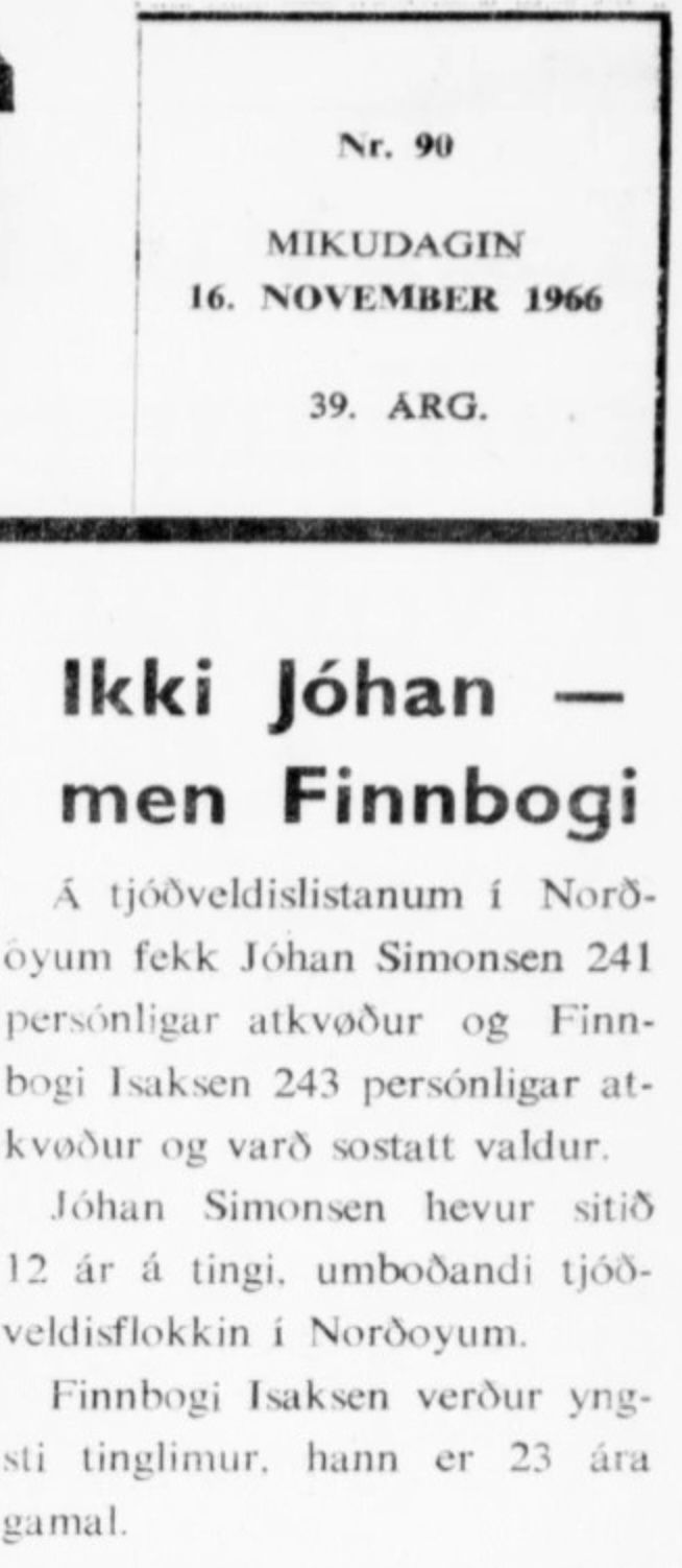 23 ára gamli Finnbogi Isaksen vann á 49 ára gamla Jóhann Simonsen í Norðoya valdømi í 1966. Tað var dramatikkur, tí valkvøldið stór Jóhann Simonsen at endurvinna sessin. Men í fínteljingini fóru Finnbogi Isaksen tvær atkvøður framum til 243 atkvøður. Sama dramatikkur sum hesaferð millum Jóhan Christiansen og Eirik í Jákupsstovu