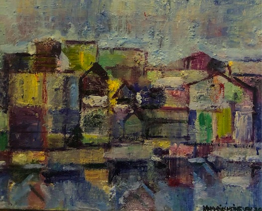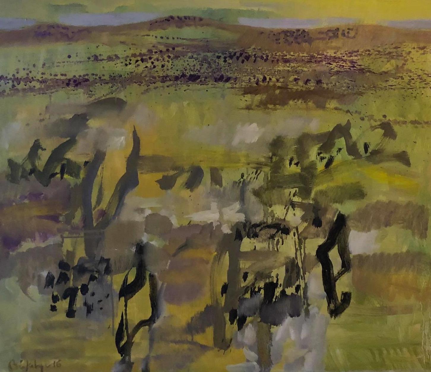 - Hann tekur kanska støðið í einum bygdalagi ella eini landslagsformatión, men skapini eru so geometrisk, litspælið so egið og vakurt, at tað neyvan finnist nakar annar enn akkurát Zacharias, sum sær soleiðis. Kompositiónin er blá og samstundis, sum vit ikki ivast í, hvar vit eru, er talan um eina abstrakta kompositión, har bláu litbrigdini, summi kám, onnur skyggjandi, klinga saman við vínreyðum, grønum og ljósareyðum.