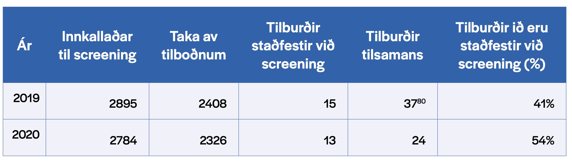 Sum tað sæst á talvuni niðanfyri, verða fleiri tilburðir av bróstkrabba uppdagaðar í hesum kanningunum. Tey bæði árini 2019 og 2020, vórðu 41 prosent og 54 prosent av øllum tilburðunum av bróstkrabba, uppdagaðar undir hesum kanningunum. Í 2029 vóru 15 tilburðir uppdagaðir í hesum kanningum og í 2020 vórðu 13 tilburðir uppdagaðir upp á hendan mátan.