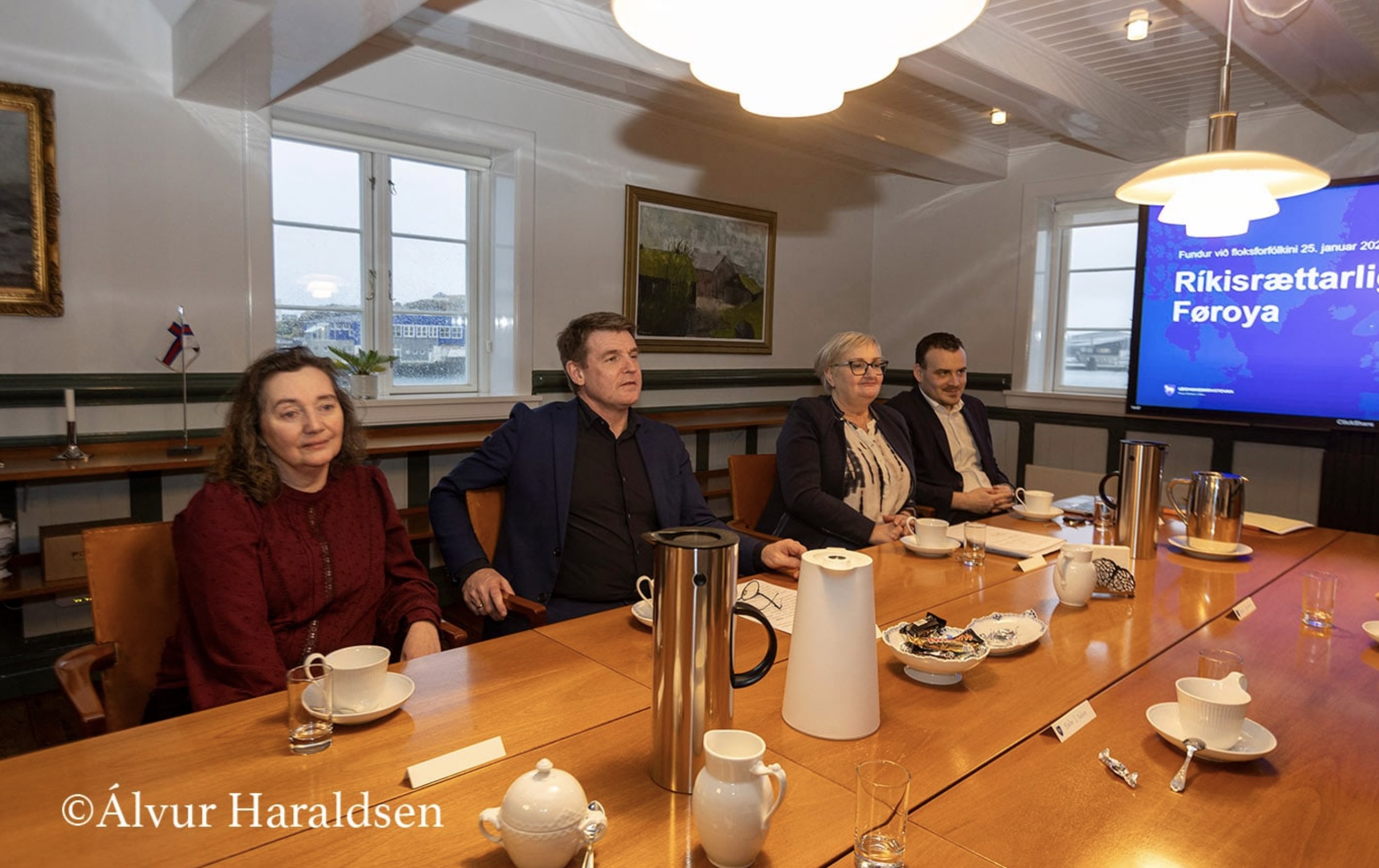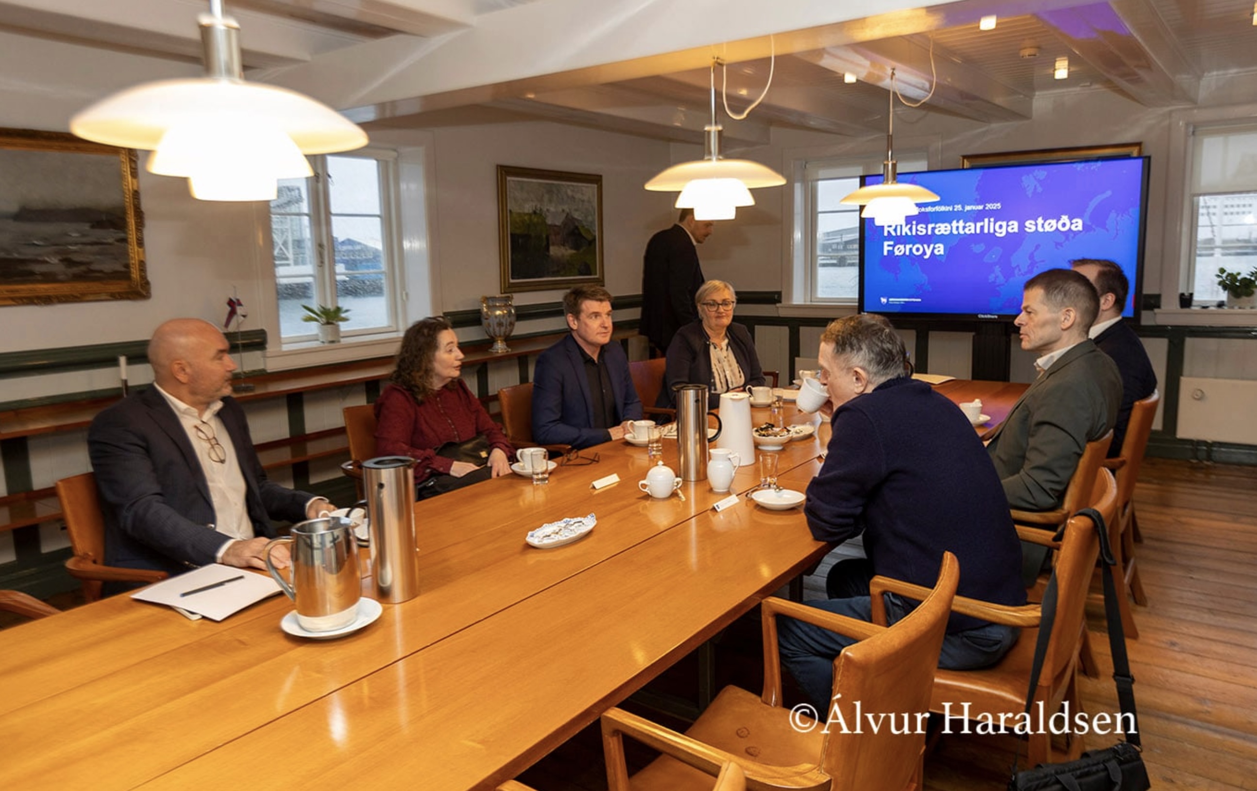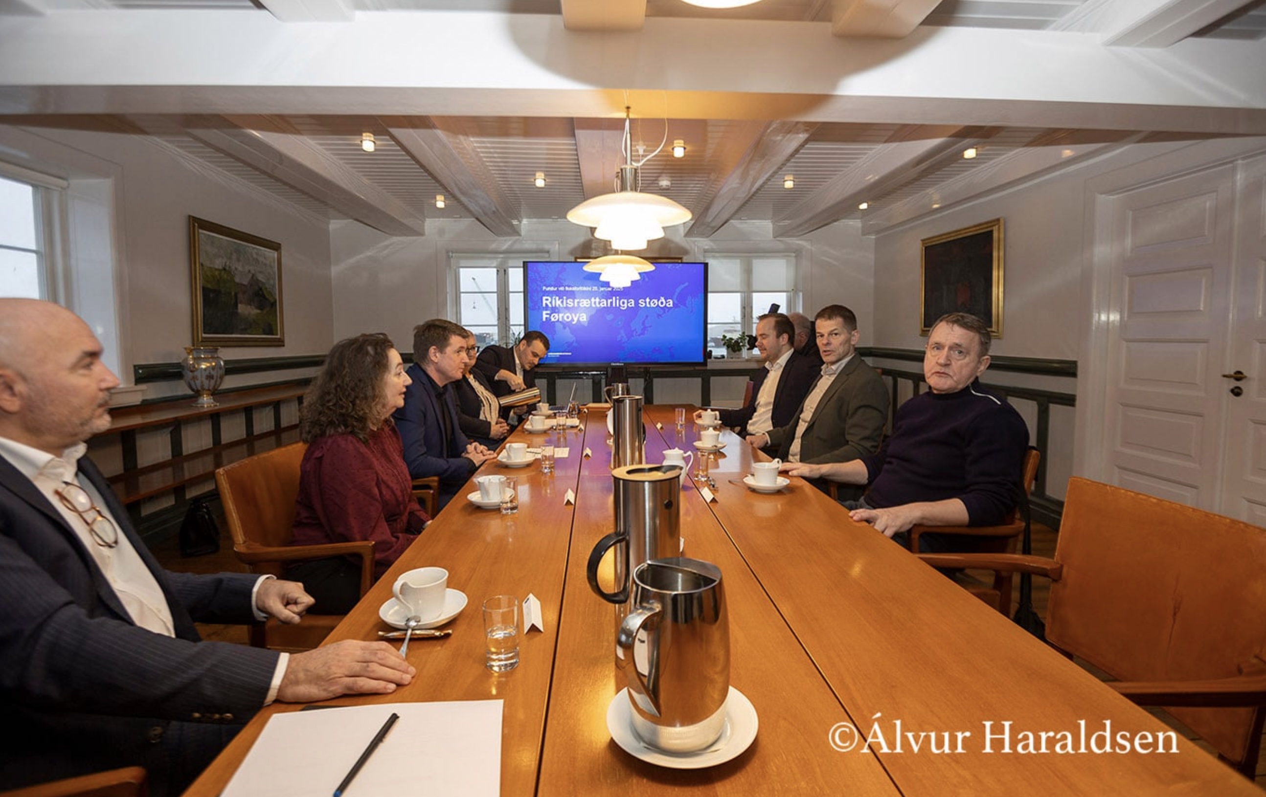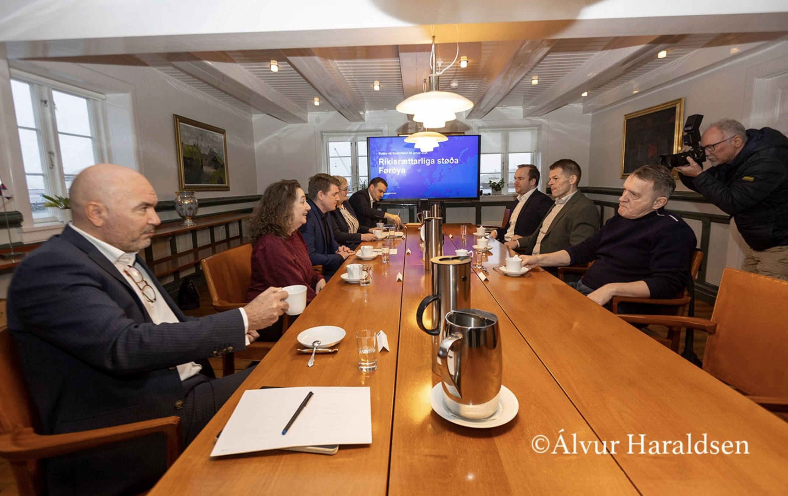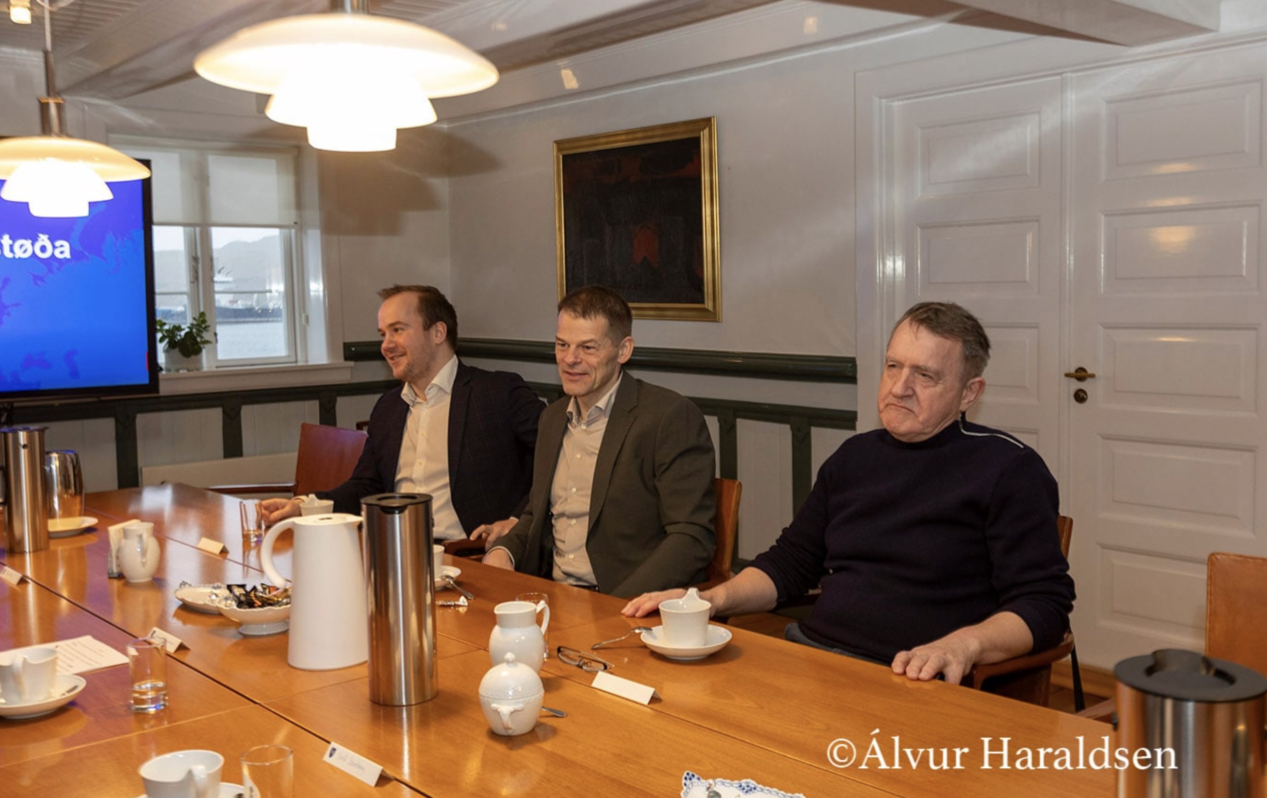 Og í hesi løtu sita forfólkini í politisku flokkunum á tingi á hesum fundi saman við løgmanni í Tinganesi. Haru eru Aksel V. Johannesen, løgmaður og formaður Javnaðarfloksins, Beinir Johannesen, formaður Fólkafloksins, Bárður á Steig Nielsen, formaður Sambandsfloksins, Sirið Stenberg, forkvinna í Tjóðveldi, Ruth Vang, forkvinna í Framsókn, og Jenis av Rana, formaður í Miðflokkinum.