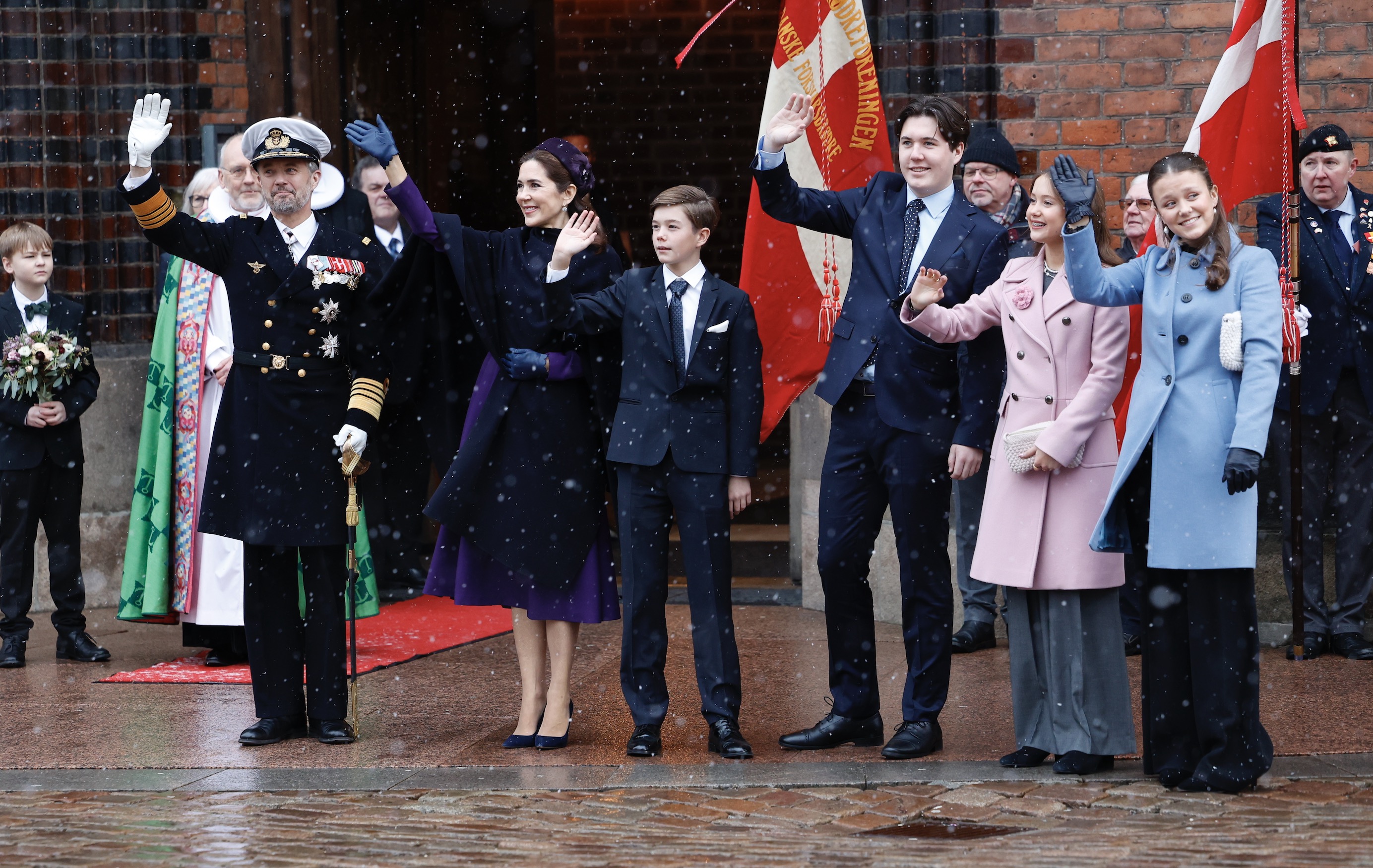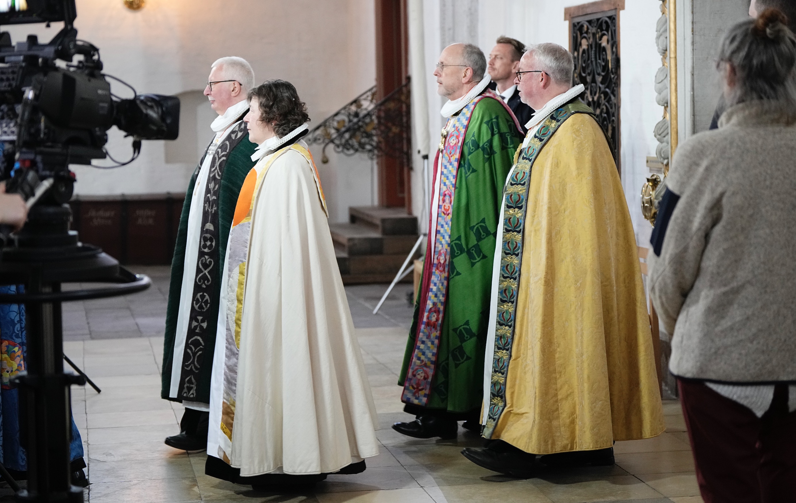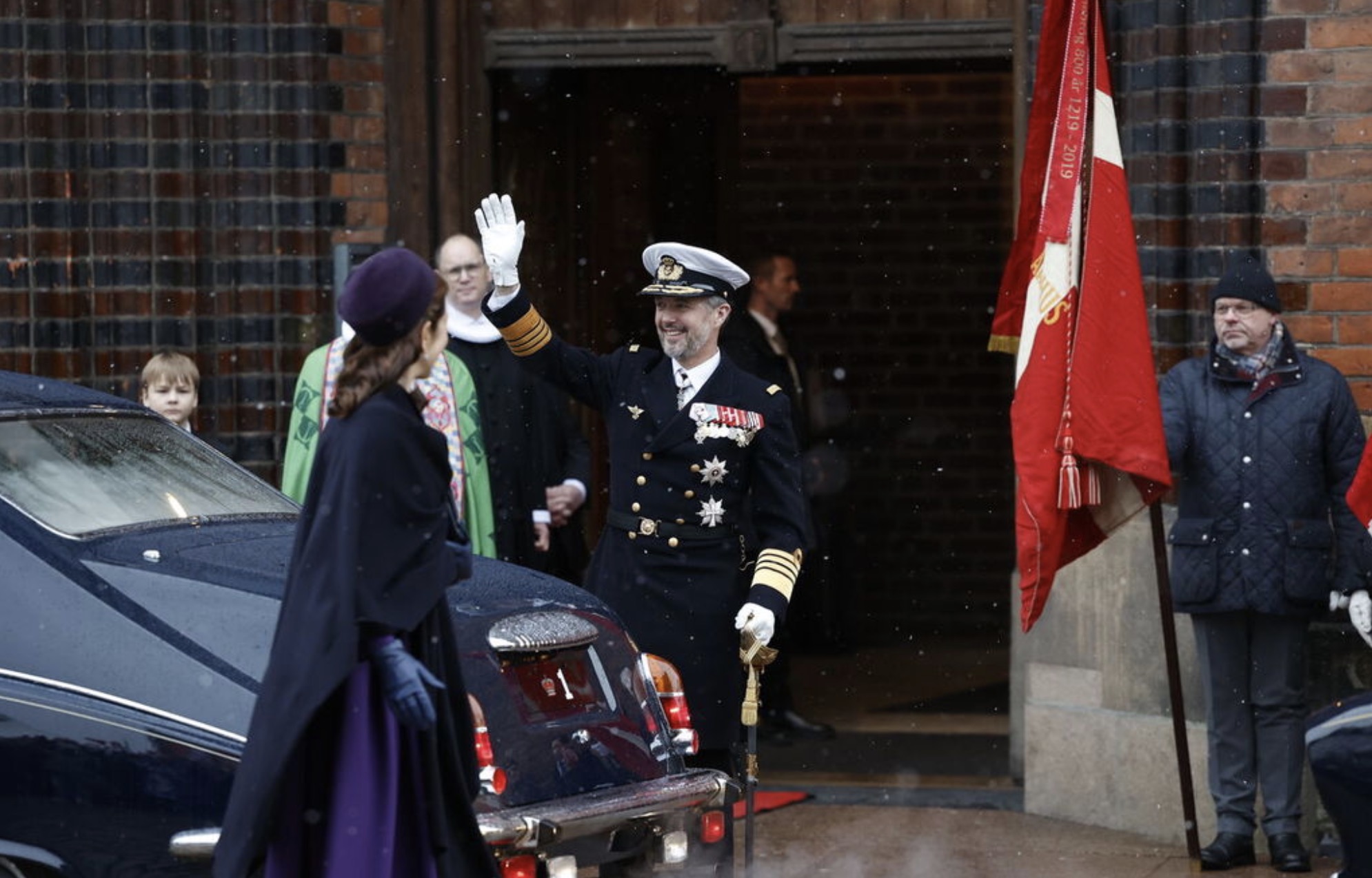 Gudstænastan verður í løtuni send í donskum sjónvarpi. Úr Føroyum er Jógvan Fríðriksson, biskupur við, saman við grønlendska biskupinum og donskum biskupum og próstum. Nógvir politikarar og umboð fyri almenna Danmark eru eisini við til hátíðargudstænastuna.