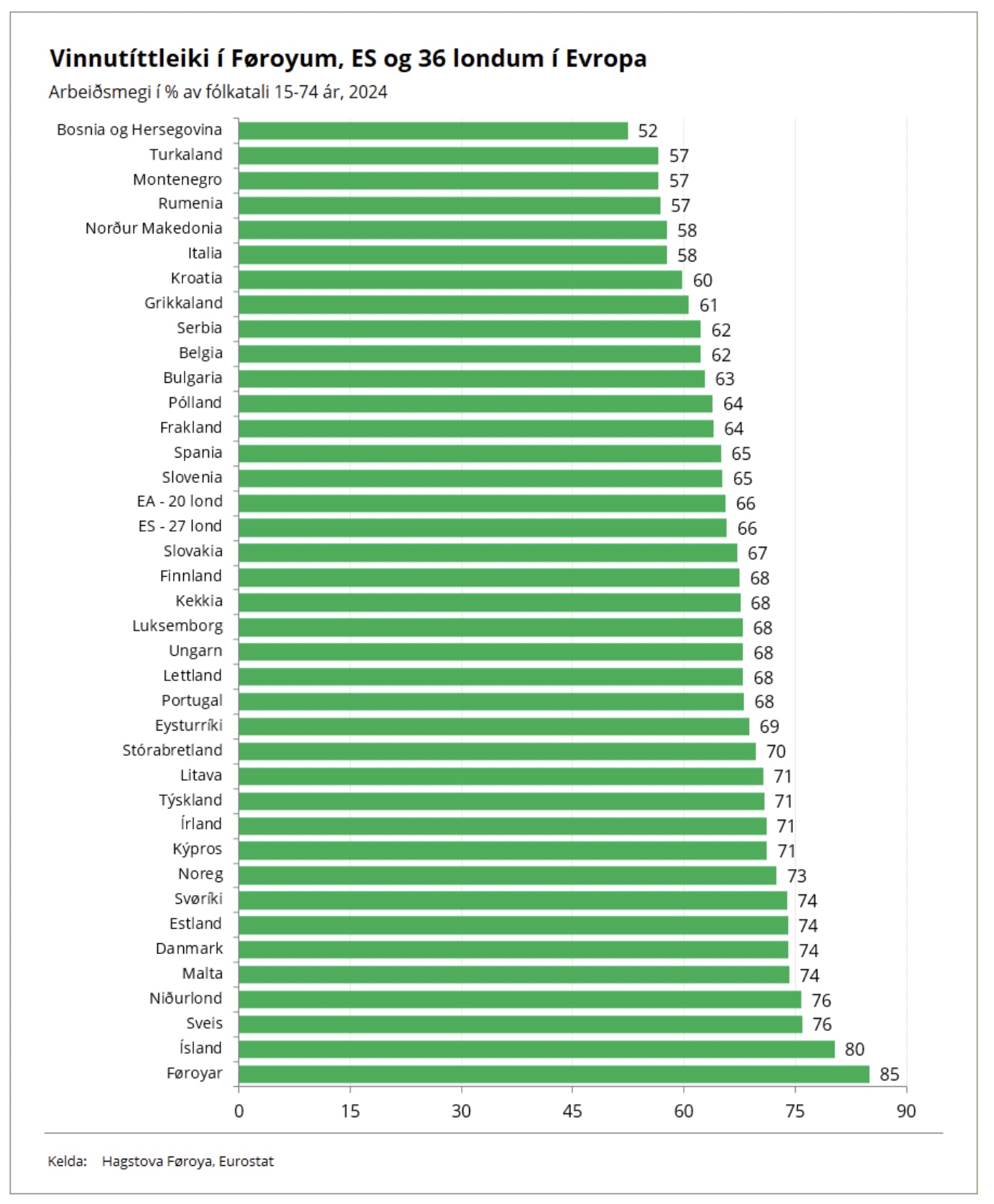 Hagtølini um føroysku arbeiðsmegina fyri 2024 eru samanborin við fjórða ársfjóring í 2024 hjá Eurostat. Aldrarnir frá 15 til 74 ár eru altjóða sambærliga aldursspennið, sum verður brúkt.