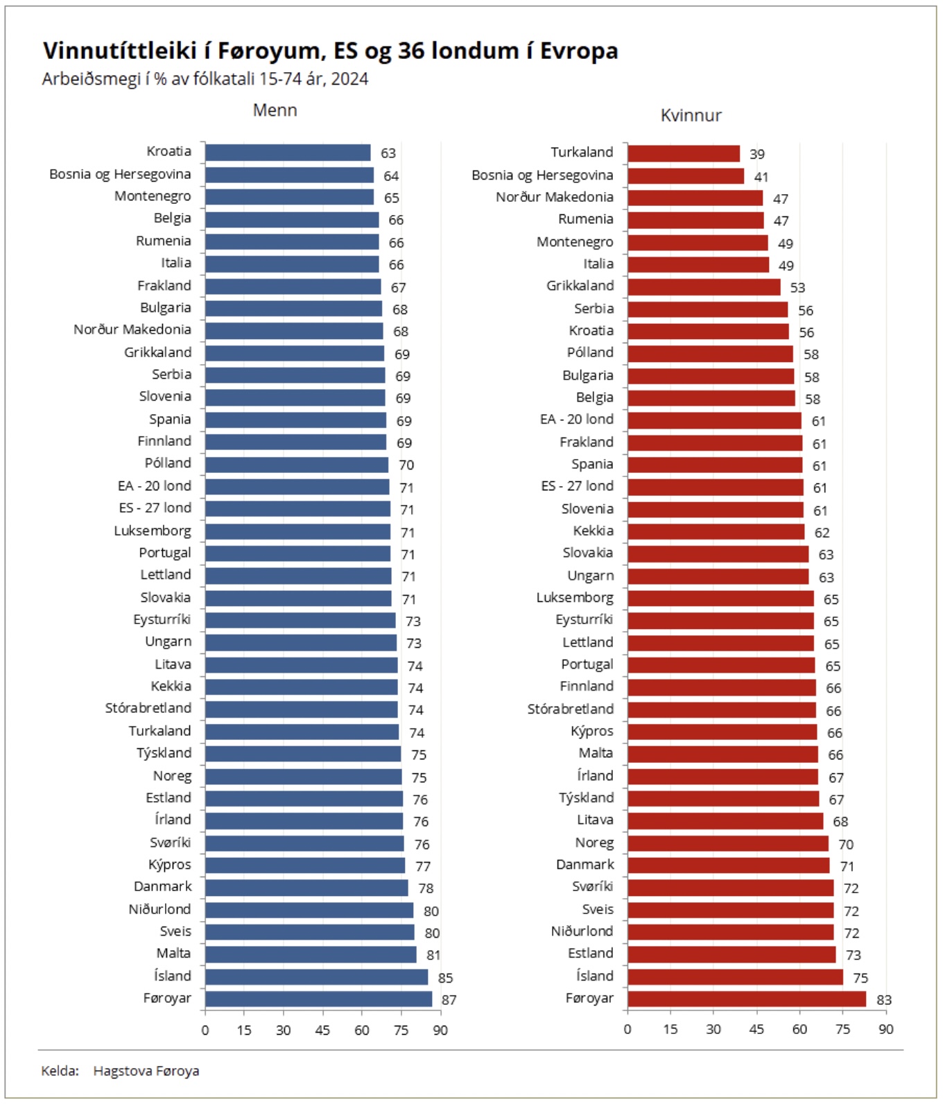 Vinnutíttleikin hjá monnum í Føroyum er 87 prosent. Í Íslandi er vinnutíttleikin 85 prosent, 78 prosent í Danmark og 71 prosent í ES.