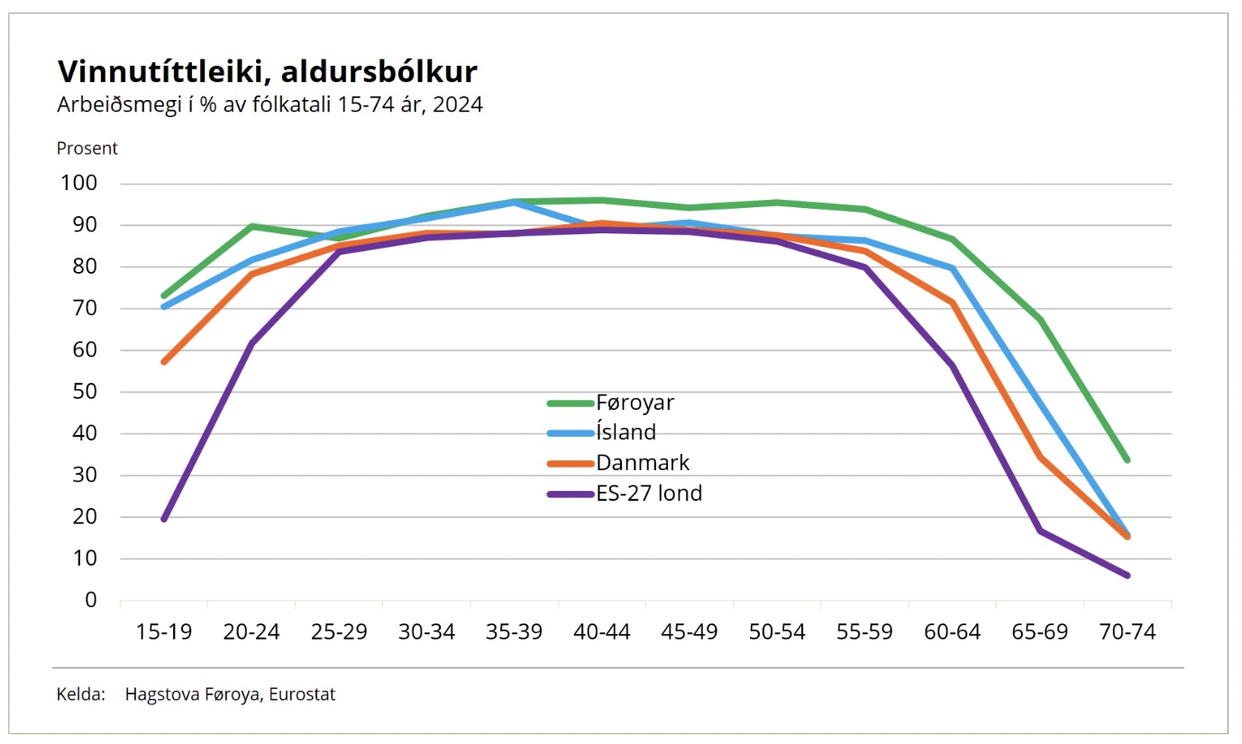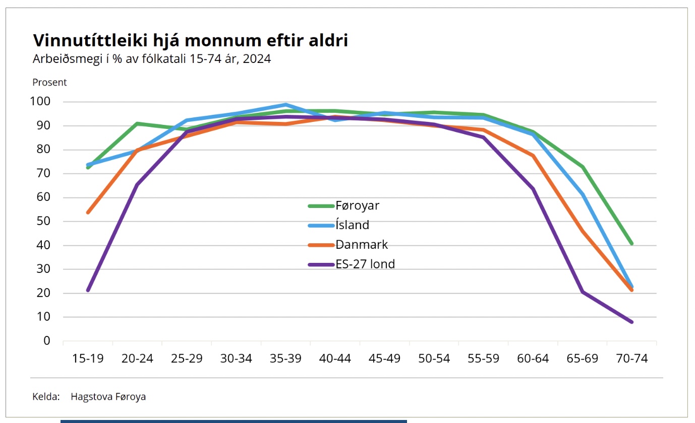 Millum tey 15 til 20 ára gomlu er vinnutíttleikin 73 prosent í Føroyum. Í Íslandi er hann 70 prosent, í Danmark 57 prosent og 20 prosent í ES. Millum tey 65 til 69 ára gomlu er vinnutíttleikin 67 prosent. Hjá 70 til 74 ára gomlum er hann 33 prosent, sum er meira enn tvífaldað av vinnutíttleikanum í Íslandi og Danmark.