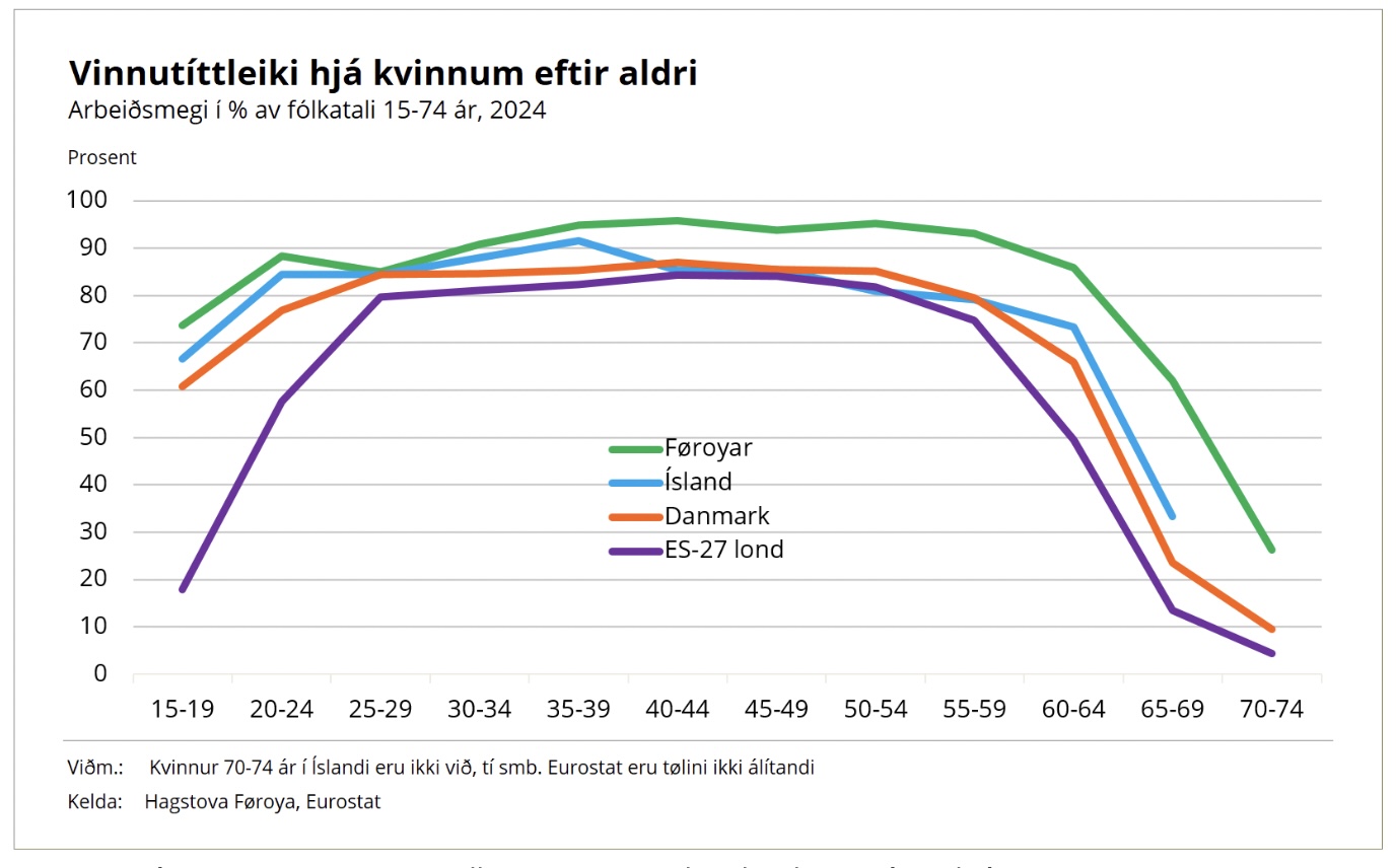 Vinnutíttleikin hjá føroyskum kvinnum er væl oman fyri vinnutíttleikan í øðrum londum í nærum øllum aldursbólkum. Danmark og Ísland hava sama vinnutíttleika fyri kvinnur í aldursbólkinum 25 til 29 ár.