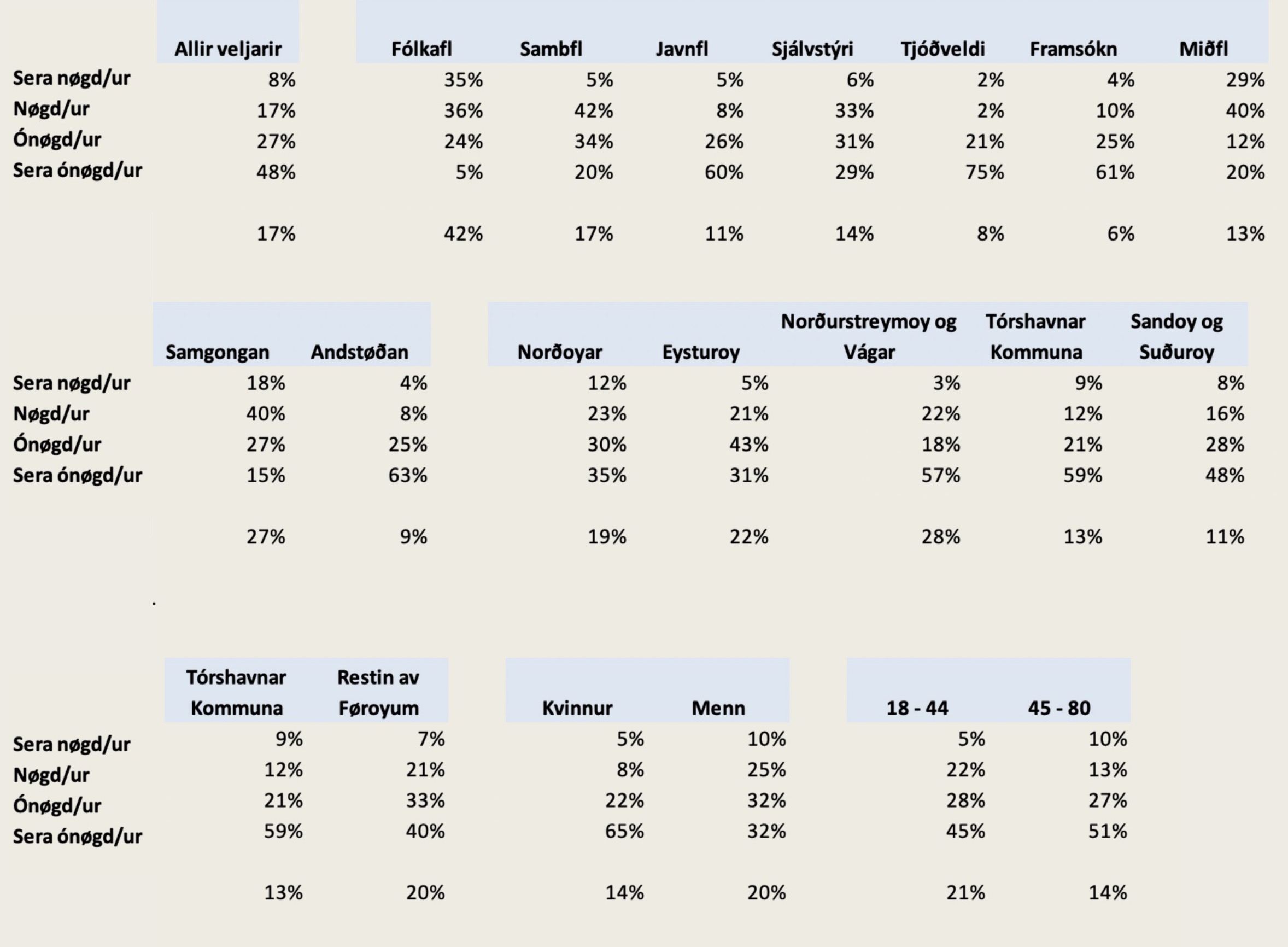 Tað eru bara 8 prosent, sum eru sera væl nøgd við tað, og saman við teimum 17 prosentunum, sum eru »nøgd«, hava vit 25 prosent, sum halda tað vera í ordan.