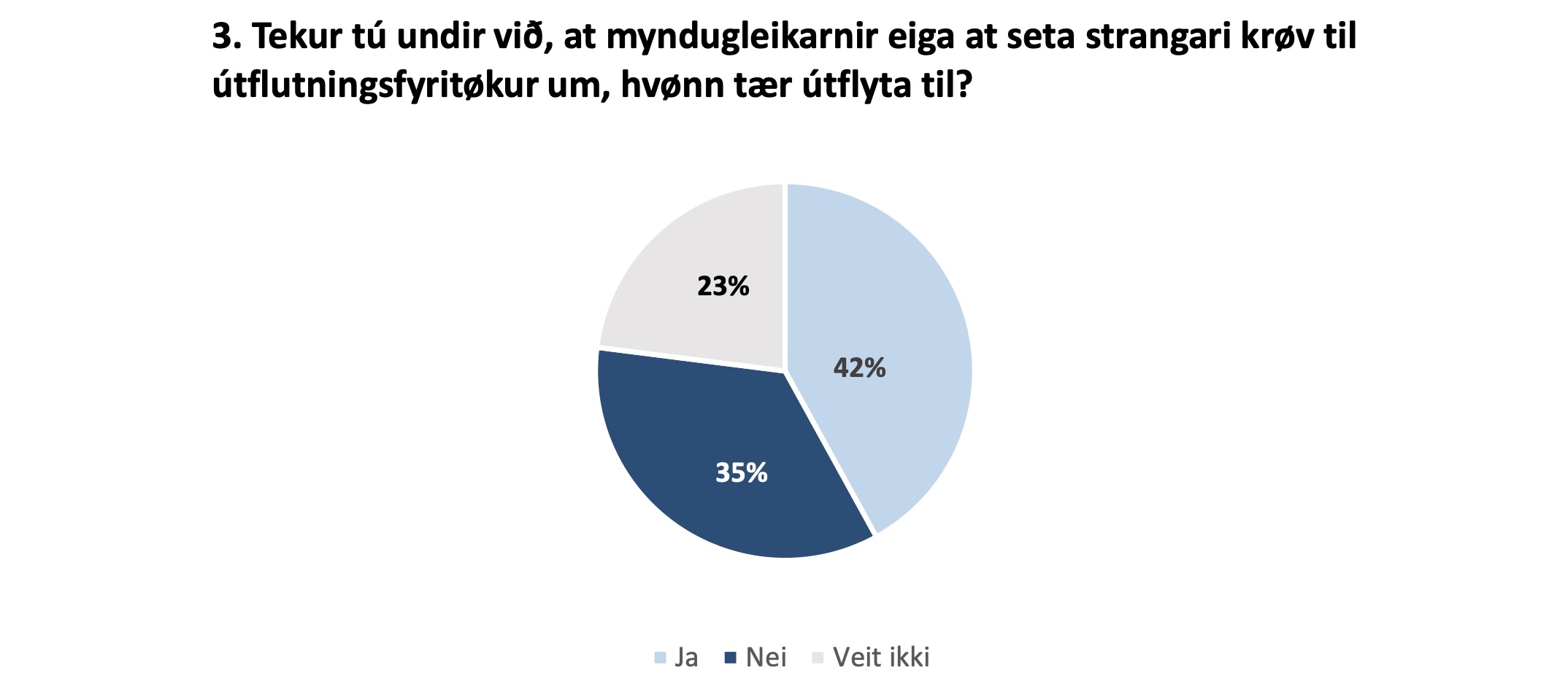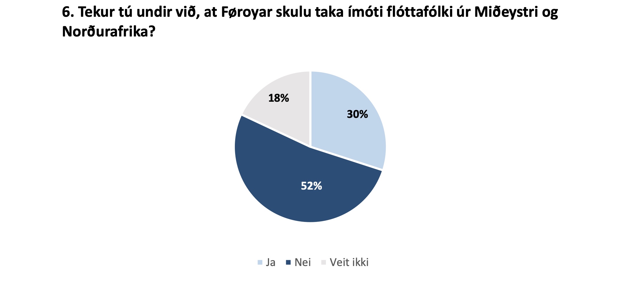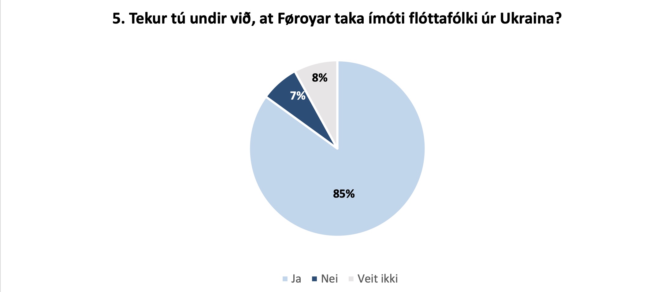 Kanningin vísir eisini, at nógv tey flestu (85%) taka undir við, at Føroyar hava tikið ímóti flóttafólki úr Ukraina. Til samanberingar eru bert 30%, sum siga seg taka undir við, at Føroyar taka ímóti flóttafólki úr Miðeystri og Norðurafrika.