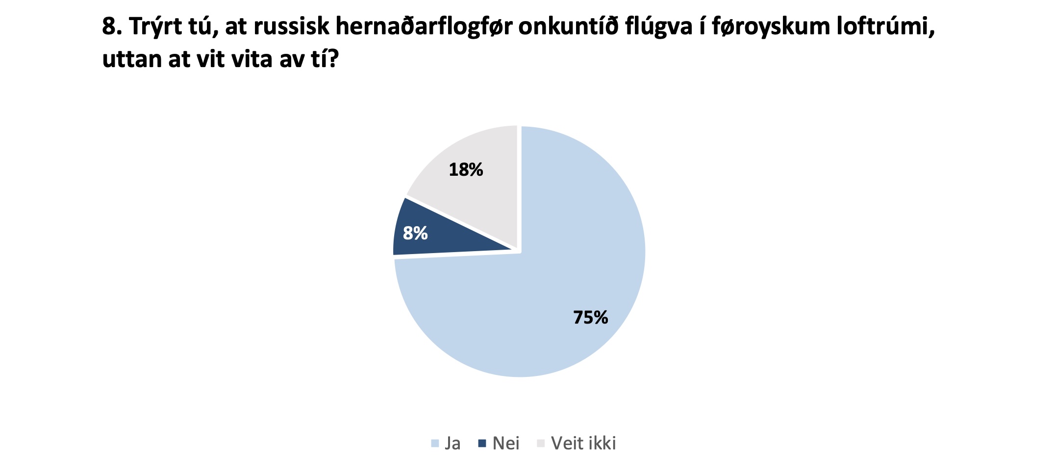 Eisini er tað ein stórur meiriluti av føroyingum (75%), sum halda, at russisk hernaðarflogfør gera regluligar flúgvingar í føroyskum loftrúmi.
