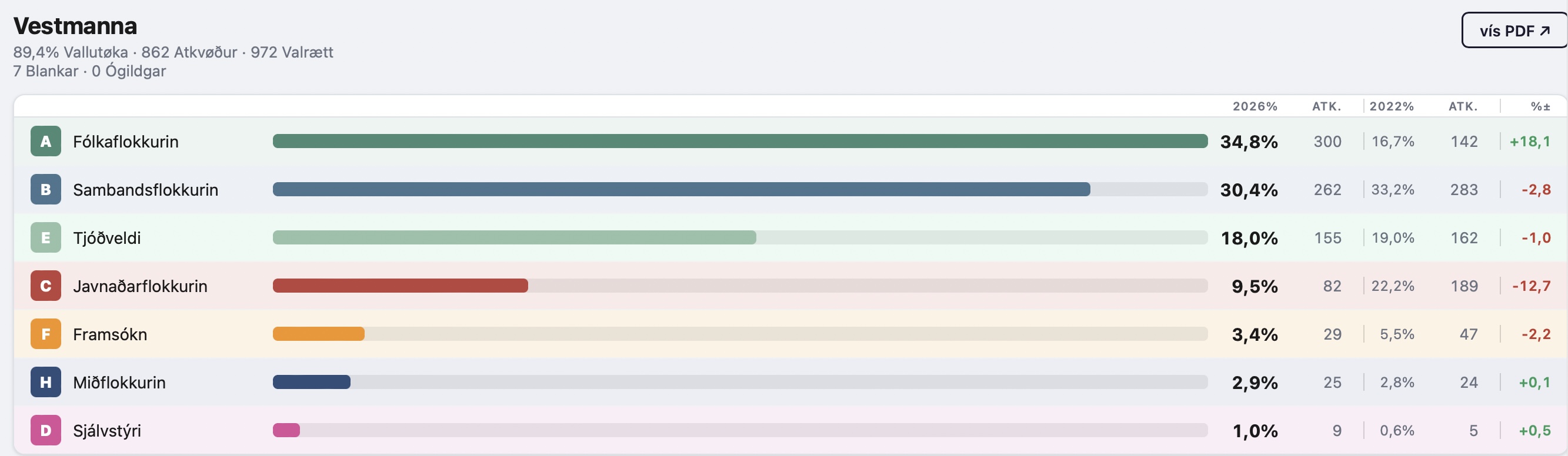 Størstu afturgongdina í Vestmanna hevur Javnaðarflokkurin, sum missir 12,7 prosentstig.