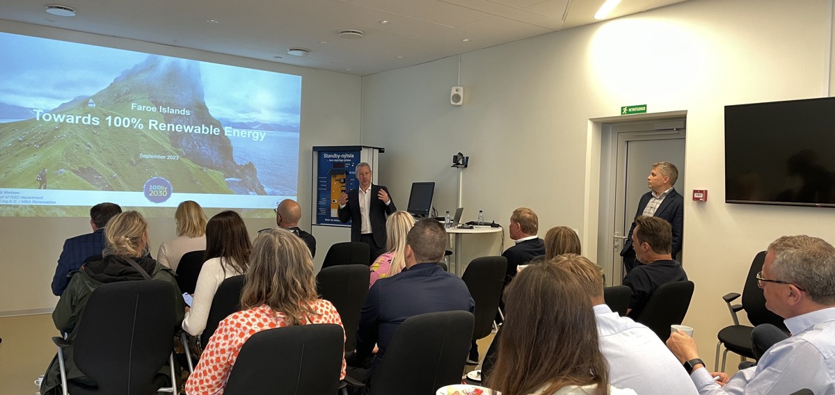 Bogi Bendtsen og Terji Nielsen greiddu frá ætlanunum hjá SEV, herundir hvørjir møguleikar eru og hvør nýggj tøkni skal til fyri at røkka málinum, og tær avbjóðingar tað hevur við sær, at reka eina 100% avbyrgda elskipan fram móti 100% burðardyggari elframleiðslu á landi í 2030.