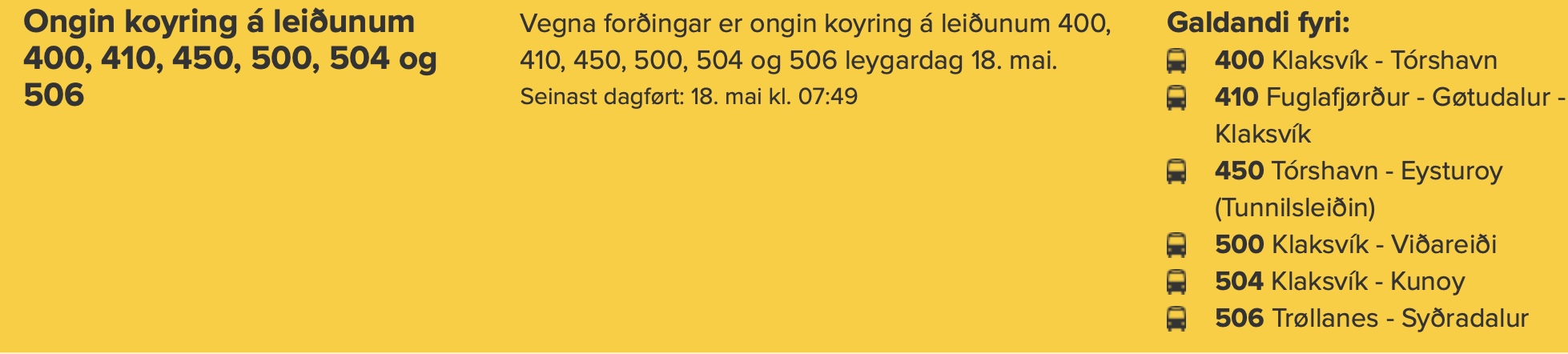 Vegna forðingar er ongin koyring á leiðunum 400, 410, 450, 500, 504 og 506 leygardag 18. mai.«