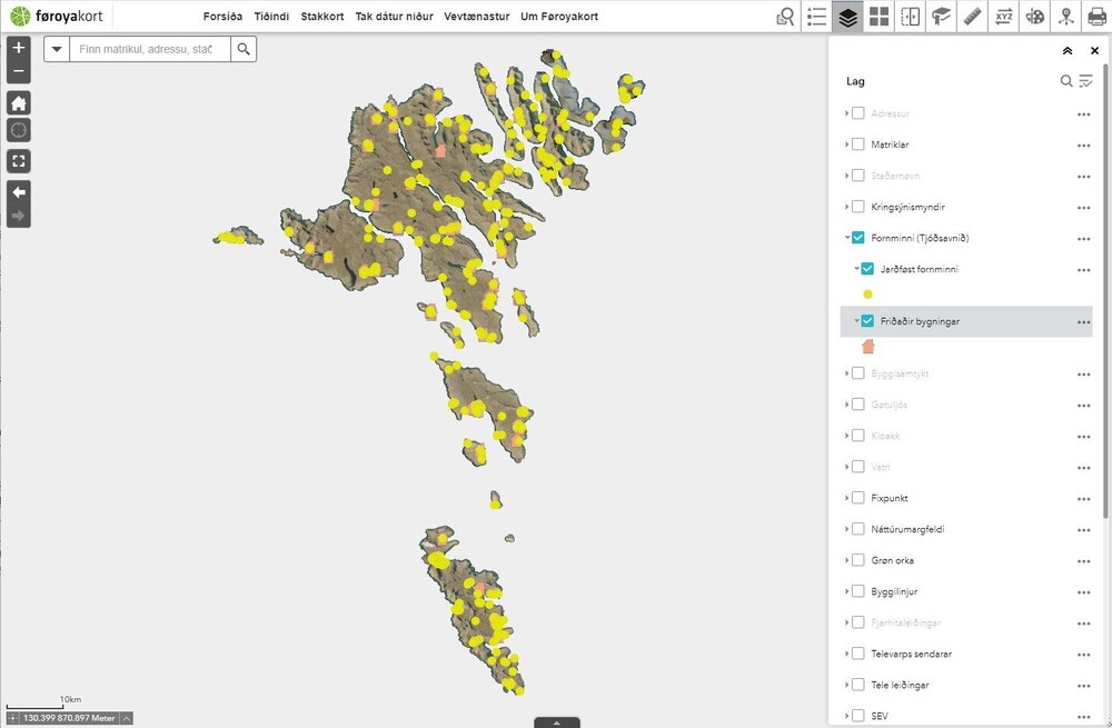 Jarðføst fornminni og friðaðir bygningar eru nú eisini at finna sum løg á kortalinum hjá Umhvørvisstovuni www.kortal.fo. Kortløg eru staðsettar dátur, sum kunnu leggjast á eitt bakgrundskort, eitt nú føroyakort. Onnur kortløg eru yvir adressur, matriklar, staðarnøvn o.a.