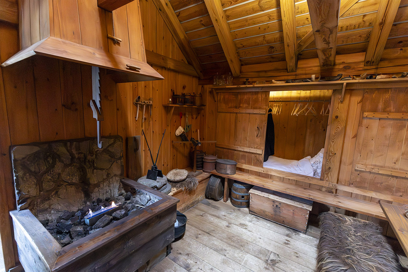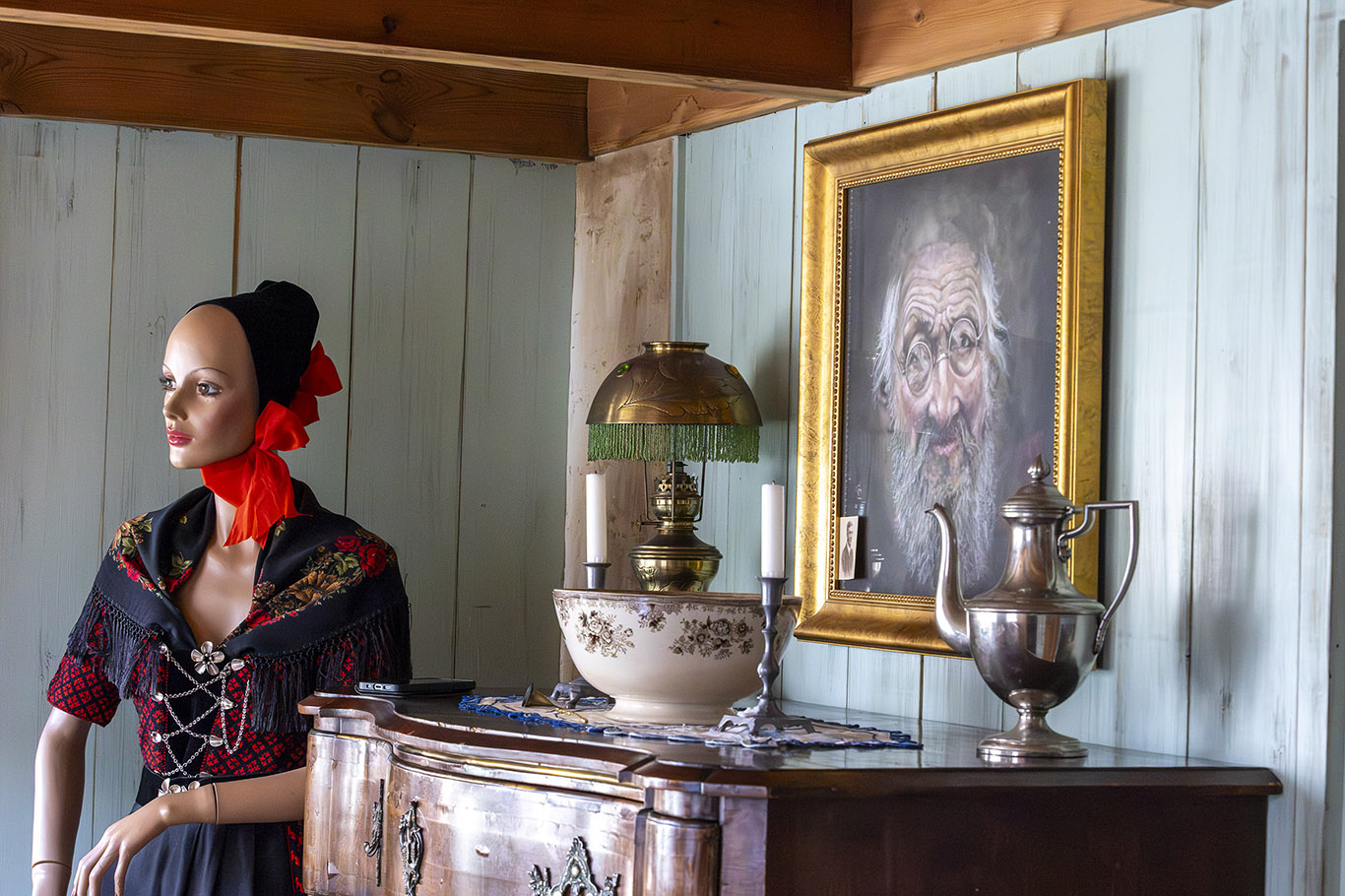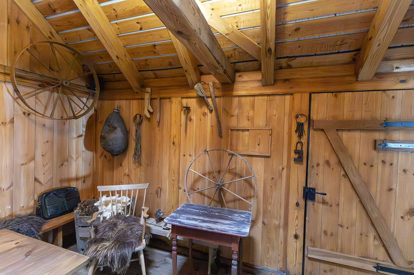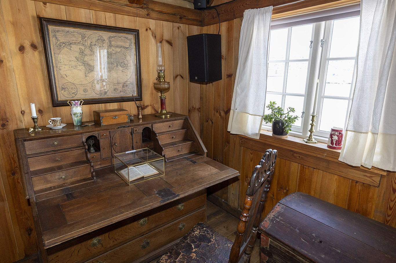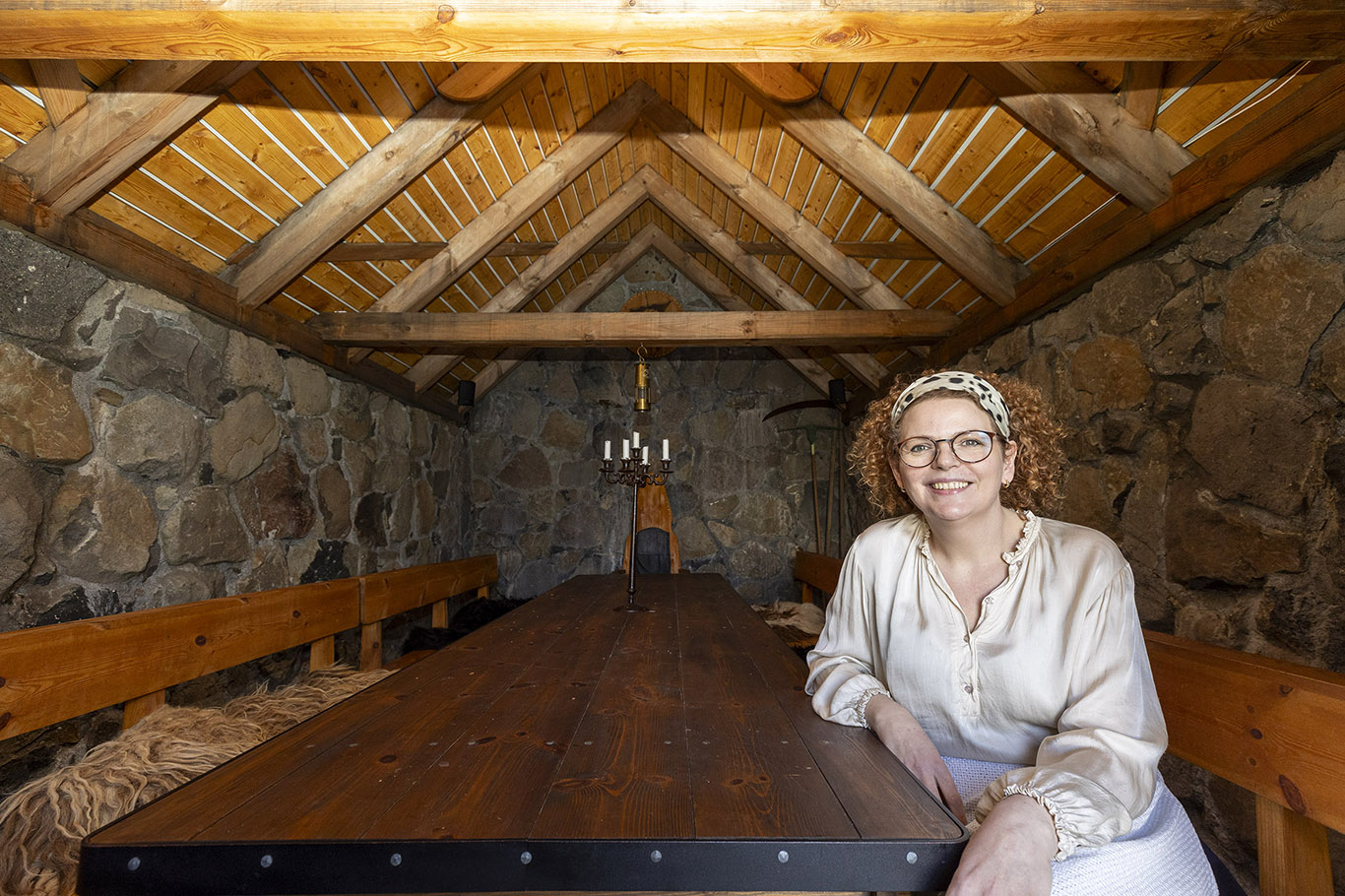 - Hon hevur sitið her og lært nógvar kvinnur at veva. Vit hava innrættað hetta rúmið meiri "kvinnuligt", tí hon er frúan í húsinum, og hevur kanska sitið her og hugnað sær við vinkonunum, meðan menninir hava sitið úti í roykstovuni og bundið.
