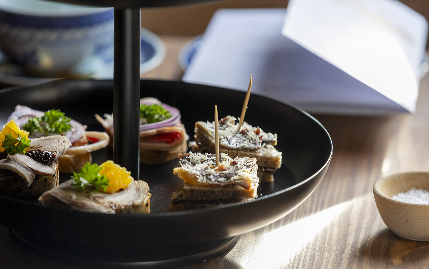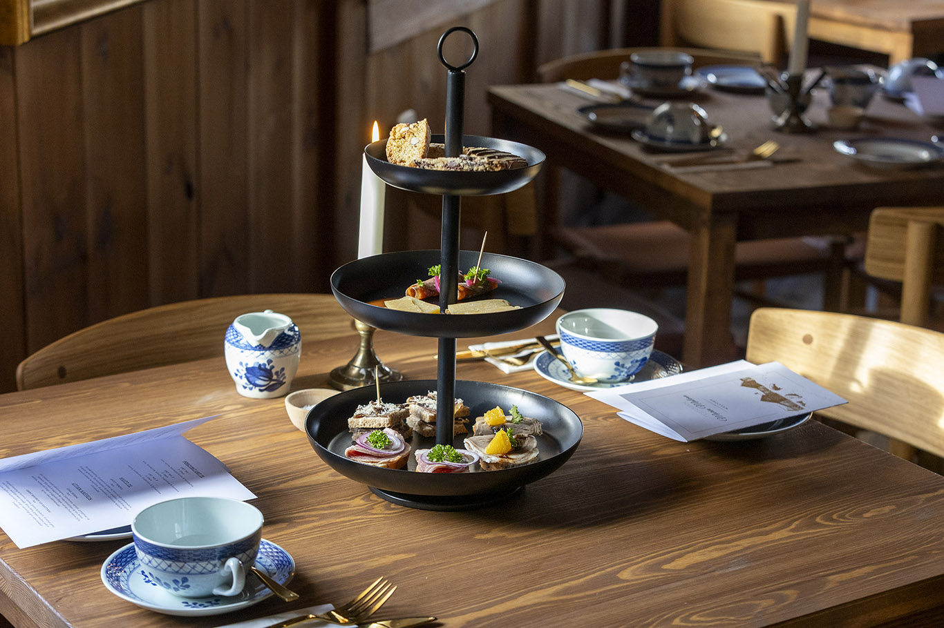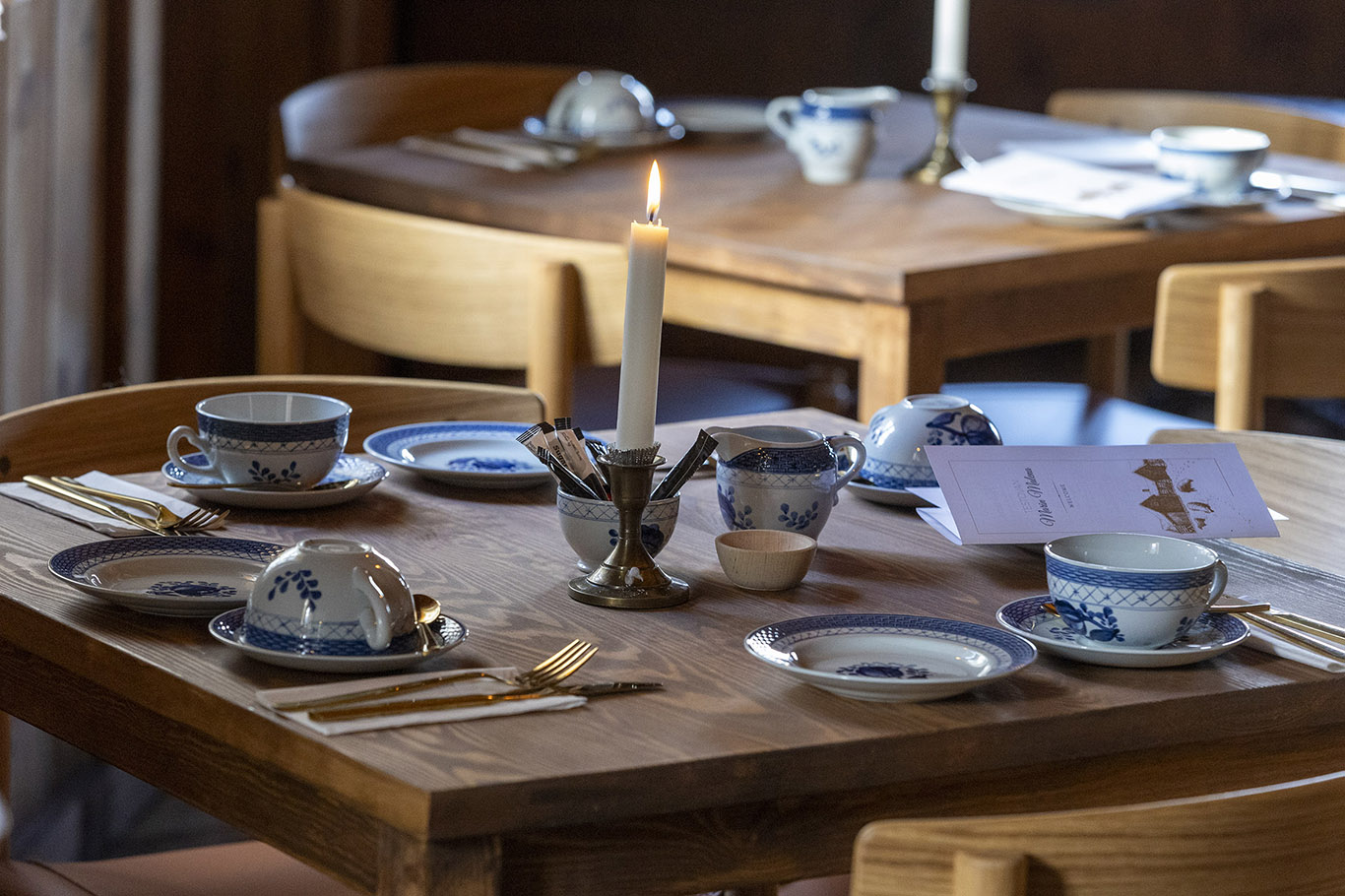Á Testovuni er stórt úrval av te, og afturvið verður borðreitt við føroyskum mati eftir árstíðini. Í løtuni eitt nú skerpikjøt, rullusteik, rullupylsu, kjøtpylsu, og endað verður við belgiskum vaflum, sum eru gjørdar við íblástri úr vaflujarninum, sum er varðveitt eftir Nólsoyar Páll og Marin Malenu.