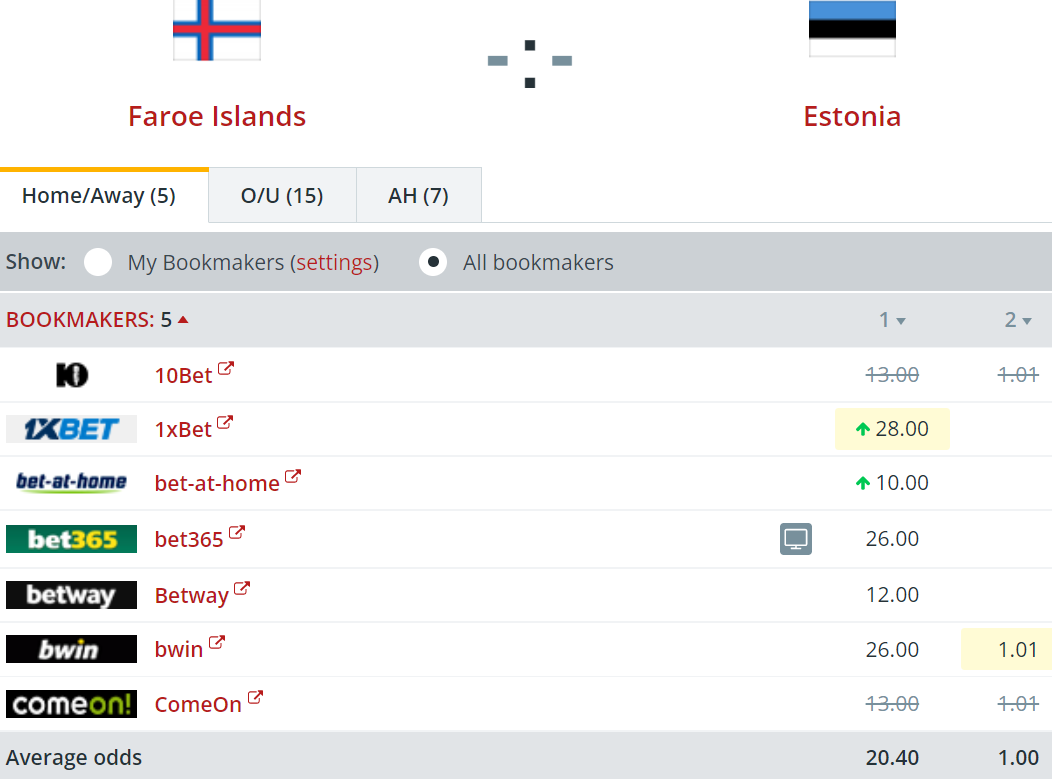 Tann eina veddingarfyritøkan bjóðar 1,01 í oddsum uppá estiskan sigur. T.v.s. 100 krónur settar uppá estiskan sigur geva ein vinning uppá 101 krónur.