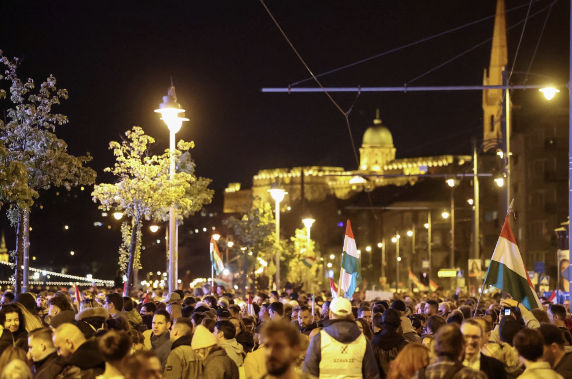Ungarar bíða eftir Péter Magyar, leiðara í andstøðuflokkinum Tisza, valkvøldið í miðbýnum í Budapest. - Mynd: Leonhard Foeger/Reuters