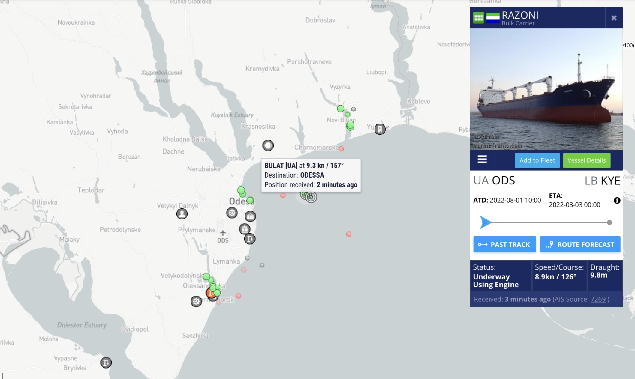 Tað er farmaskipið »Razoni«, sum siglir undir sierraleonskum flaggi, sum er farið úr Odesa. Skipið er lastað við yvir 26.000 tonsum av majsi og hevur kós ímóti Libanon.